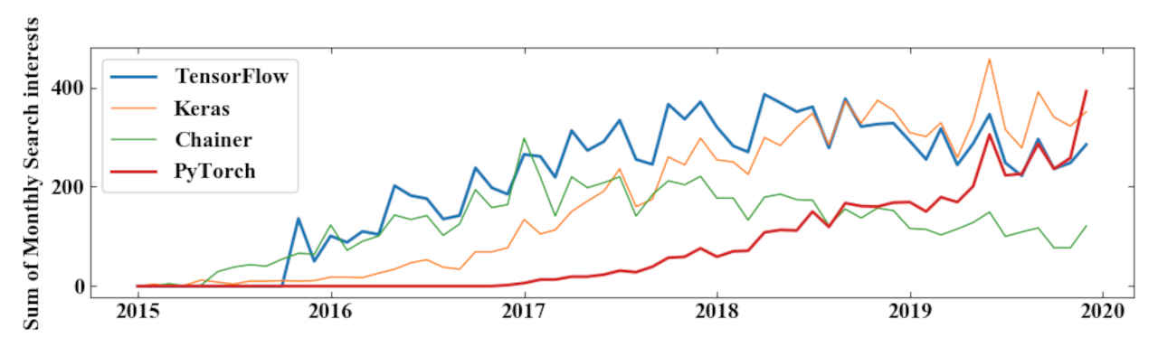 ・人工知能の分野においての最先端の研究者が使用している事例も増えており、PyTorchの海外コミュニティも活発であり参考となるソースが多い点もシェアが高い理由の1つと言える。