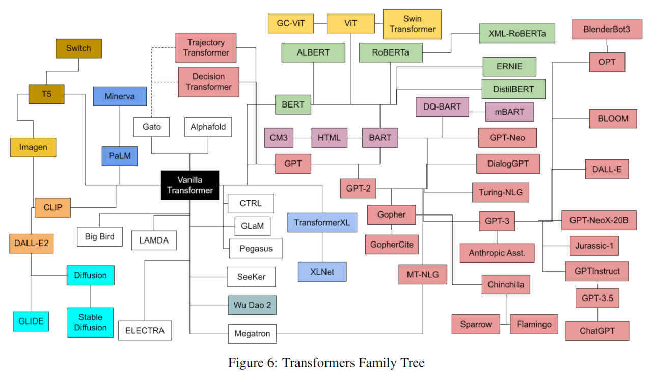 角国の企業や研究機関で開発された Transformer モデル、もしくは Transformer モデルを含んだ AIツール。大きな流れとしてグーグルと OpenAI社が主要な開発を行っている。グーグルが開発した「BERT」から派生したもの、OpenAI社の「GPT」から派生したものなどがある。OpenAI社の「CLIP」を起源とする画像生成AIも Transformer アーキテクチャのファミリ・ツリーを広げている。「BERT」「GPT」「CLIP」の深層モデルを中心にこれらをもとにしたAIツールが作られている。