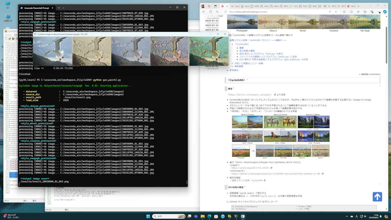 (py38_learn) python test2.py CycleGan test program Ver. 0.01: Starting application... - dataroot : C:/anaconda_win/workspace_2/CycleGAN/images - source_dir : C:/anaconda_win/workspace_2/CycleGAN/images - result_path : ./results/result.png - load_size : 1024 <style_ukiyoe_pretrained> result images → ./results/style_ukiyoe_pretrained processing (0000)-th image... C:/anaconda_win/workspace_2/CycleGAN/images/20210117_091324_001m.jpg processing (0001)-th image... C:/anaconda_win/workspace_2/CycleGAN/images/20210121_082725_001m.jpg processing (0002)-th image... C:/anaconda_win/workspace_2/CycleGAN/images/20210130_073729_001m.jpg processing (0003)-th image... C:/anaconda_win/workspace_2/CycleGAN/images/20210221_082254_001m.jpg processing (0004)-th image... C:/anaconda_win/workspace_2/CycleGAN/images/20210329_101513_001m.jpg <style_monet_pretrained> result images → ./results/style_monet_pretrained processing (0000)-th image... C:/anaconda_win/workspace_2/CycleGAN/images/20210117_091324_001m.jpg processing (0001)-th image... C:/anaconda_win/workspace_2/CycleGAN/images/20210121_082725_001m.jpg processing (0002)-th image... C:/anaconda_win/workspace_2/CycleGAN/images/20210130_073729_001m.jpg processing (0003)-th image... C:/anaconda_win/workspace_2/CycleGAN/images/20210221_082254_001m.jpg processing (0004)-th image... C:/anaconda_win/workspace_2/CycleGAN/images/20210329_101513_001m.jpg <style_cezanne_pretrained> result images → ./results/style_cezanne_pretrained processing (0000)-th image... C:/anaconda_win/workspace_2/CycleGAN/images/20210117_091324_001m.jpg processing (0001)-th image... C:/anaconda_win/workspace_2/CycleGAN/images/20210121_082725_001m.jpg processing (0002)-th image... C:/anaconda_win/workspace_2/CycleGAN/images/20210130_073729_001m.jpg processing (0003)-th image... C:/anaconda_win/workspace_2/CycleGAN/images/20210221_082254_001m.jpg processing (0004)-th image... C:/anaconda_win/workspace_2/CycleGAN/images/20210329_101513_001m.jpg <style_vangogh_pretrained> result images → ./results/style_vangogh_pretrained processing (0000)-th image... C:/anaconda_win/workspace_2/CycleGAN/images/20210117_091324_001m.jpg processing (0001)-th image... C:/anaconda_win/workspace_2/CycleGAN/images/20210121_082725_001m.jpg processing (0002)-th image... C:/anaconda_win/workspace_2/CycleGAN/images/20210130_073729_001m.jpg processing (0003)-th image... C:/anaconda_win/workspace_2/CycleGAN/images/20210221_082254_001m.jpg processing (0004)-th image... C:/anaconda_win/workspace_2/CycleGAN/images/20210329_101513_001m.jpg processing start >> 2024/08/03 15:47:21 processing end >> 2024/08/03 15:47:32 processing time >> 0:00:11.018841 Finished.・CPU 動作の場合の処理時間(オプション: --gpu_id -1)