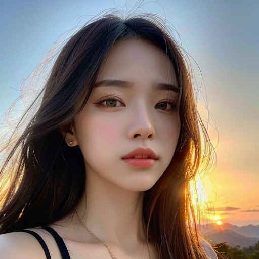| 傑作、最高品質、超高解像度、非常にリアル、女の子 1 人、美しい女性 1 人、ビューアを見る、タンクトップ、上半身、背景の山、美しい夕日、美しい目、詳細な目、詳細な髪、顔の光、 |