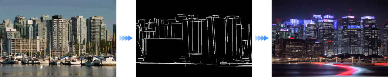 特定の形状を維持したまま、スタイルやテクスチャを変更 建物の写真からエッジを検出し、そのエッジを元に、建物のスタイルを和風や洋風に変更することができる