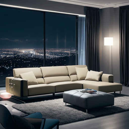 | A modular sofa with adaptive cushioning and embedded LED lighting, set in a modern living room with a panoramic city view | A futuristic smartwatch with a curved OLED display |