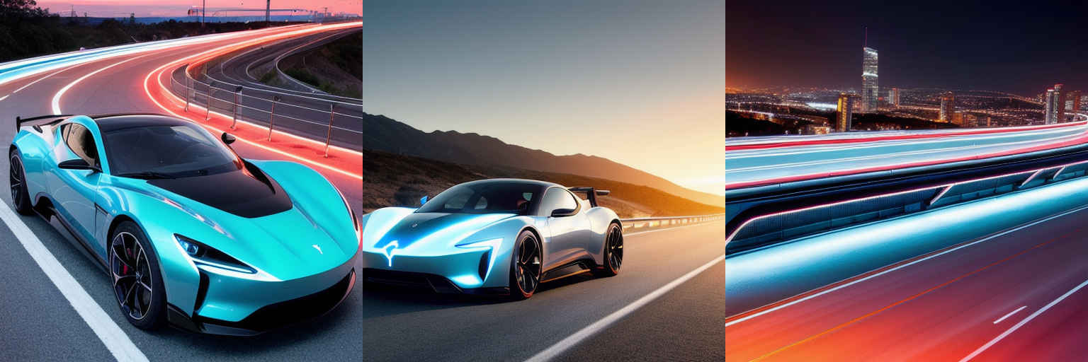 | A foldable smartphone with a seamless glass body, holographic buttons, and a transparent display, set on a marble table with soft lighting | A sleek electric sports car with aerodynamic curves, glowing LED lines, and solar-powered panels, displayed on a futuristic highway at sunset |