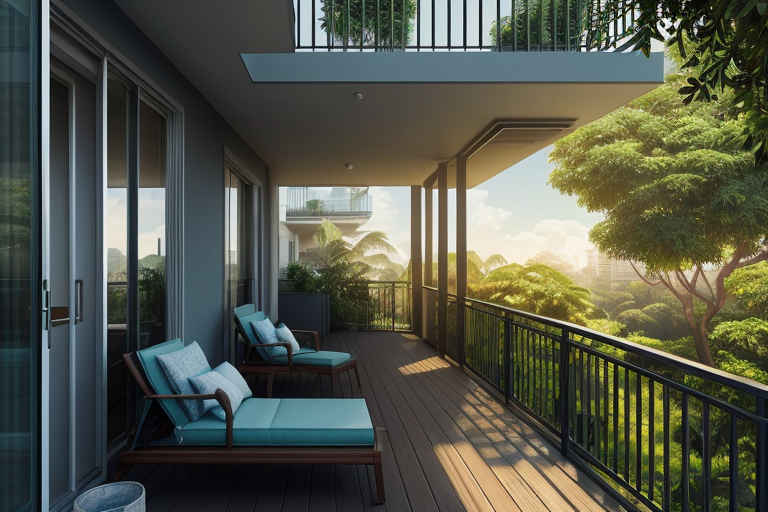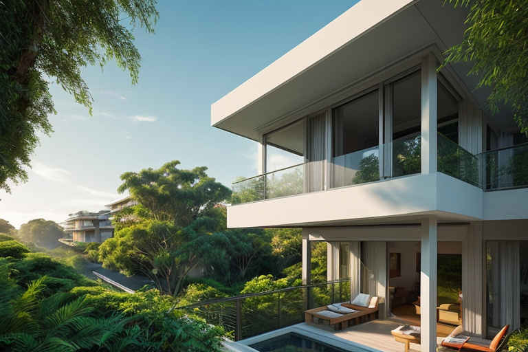 | A modern street-facing house with lush greenery on the balcony and in front of the house, portrayed in the style of digital illustration. Inspired by the artist Simon Stlenhag, the scene captures a futuristic blend of architecture and nature. The color palette leans towards cool blues and warm greens, evoking a serene ambiance. The facial expressions of the people on the balcony reflect a sense of tranquil contentment. Soft, diffused lighting enhances the dreamy atmosphere |