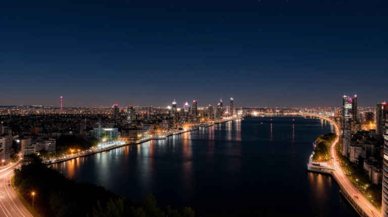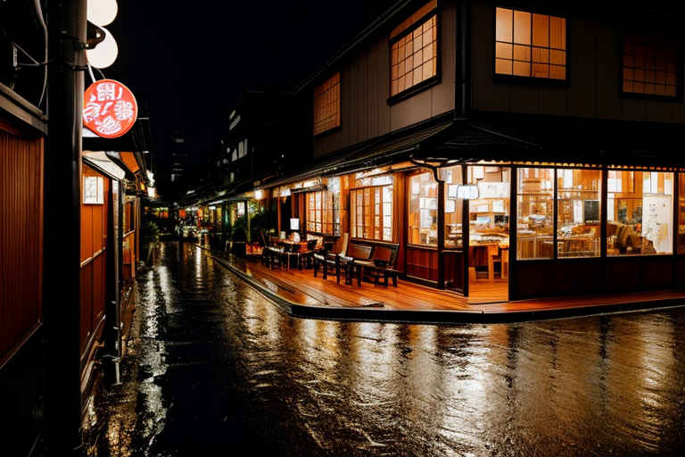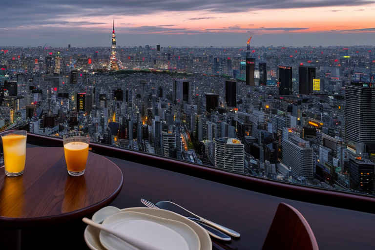 | 夕暮れの東京を一望する温もりのあるカフェ |