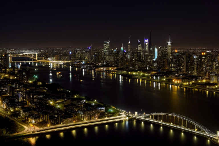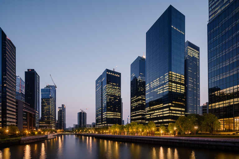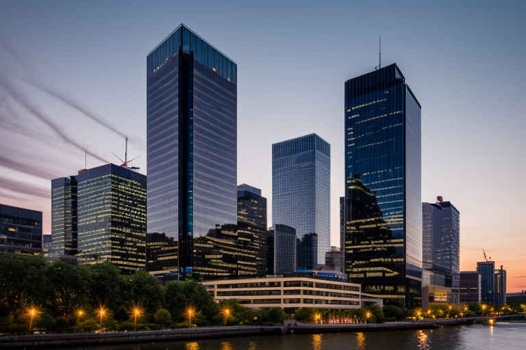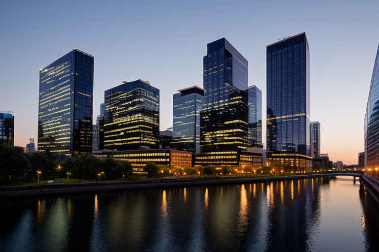 | 夕暮れの川沿いに建つガラス張りの高層オフィスビル |