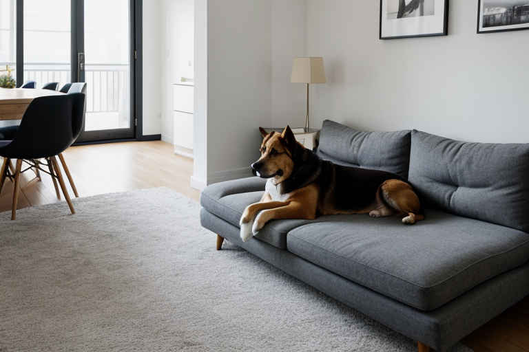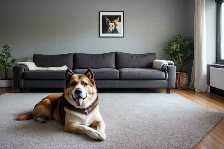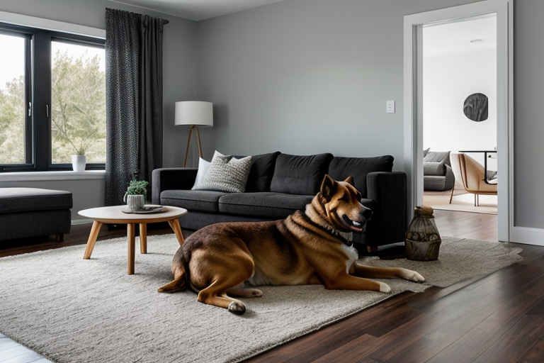 | モダンでシンプルなリビングルームで寛ぐ大型犬 |