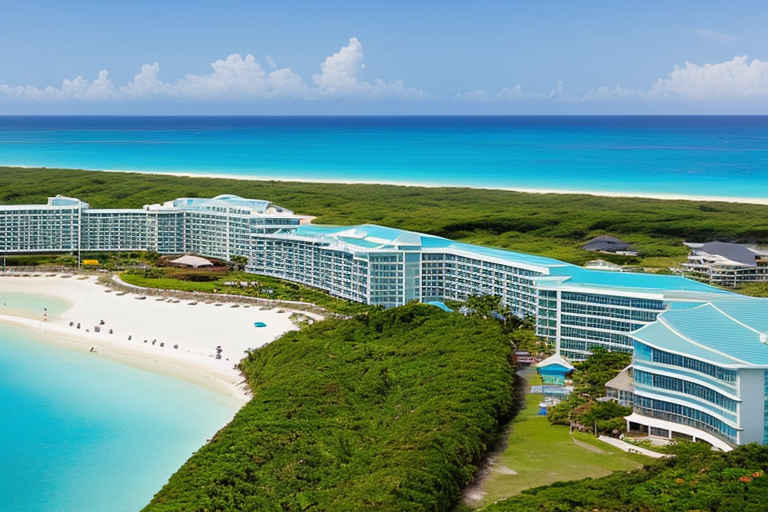 | 陽光降り注ぐ沖縄のビーチに建つリゾートホテル |