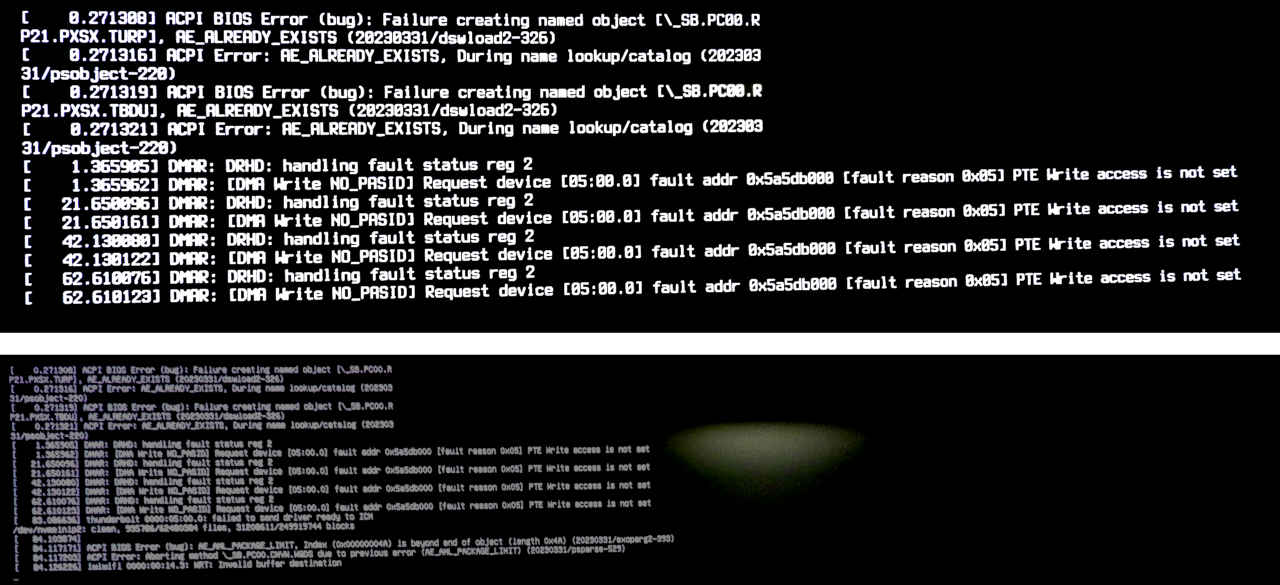 [ 0.271308] ACPI BIOS Error (bug): Failure creating named object [\_SB.PC00.R P21.PXSX.TURP], AE_ALREADY_EXISTS (20230331/dswload2-326) [ 0.271316] ACPI Error: AE_ALREADY_EXISTS, During name lookup/catalog (202303 31/psobject-228) [ 0.271319] ACPI BIOS Error (bug): Failure creating named object [\_SB.PC08.R P21.PXSX.TBDU], AE_ALREADY_EXISTS (20230331/dswload2-326) [ 0.271321] ACPI Error: AE_ALREADY_EXISTS, During name lookup/catalog (202303 31/psobject-228) [ 1.365905] DMAR: DRHD: handling fault status reg 2 [ 1.365962] DMAR: CDMA Write NO_PASID] Request device [05:00.0] fault addr 8x5a5db000 [fault reason 8x851 PTE Write access is not set [ 21.650096] DMAR: DRHD: handling fault status reg 2 [ 21.650161] DMAR: [DMA Write NO_PASID] Request device [05:00.0] fault addr 0x5a5db000 [fault reason 8x05] PTE Write access is not set [ 42.130080] DMAR: DRHD: handling fault status reg 2 [ 42.138122] DMAR: [DMA Write NO_PASID] Request device [05:00.01 fault addr 8x5a5db000 [fault reason 8x05] PTE Write access is not set [ 62.610876] DMAR: DRHD: handling fault status reg 2 [ 62.618123] DMAR: [DMA Write NO_PASID] Request device [05:00.01 fault addr 0x5a5db000 [fault reason 0x85) PTE Write access is not set [ 83.006636] thunderbolt 0000:05:00.0: failed to send driver ready to ICH /dev/nweinip2: clean, 935706/62400304 files, 31200611/249919744 blocks [ 84.103874] [ 84.117171] ACPI BIOS Error (bug): AE_AHL PACKAGE_LIMIT, Index (0x00000004A) is beyond end of object (length 0x4A) (20230331/exoparg2-393) [ 84.117203] ACPI Error: Aborting method \_SB.PCOO.CNVN.HGDS due to previous error (AE_AHL PACKAGE LIMIT) (20290331/psparse-529) [ 84.126226] imimifi 0000:00:14.3: HRT: Invalid buffer destin・動作に支障はないので現状は無視することにする