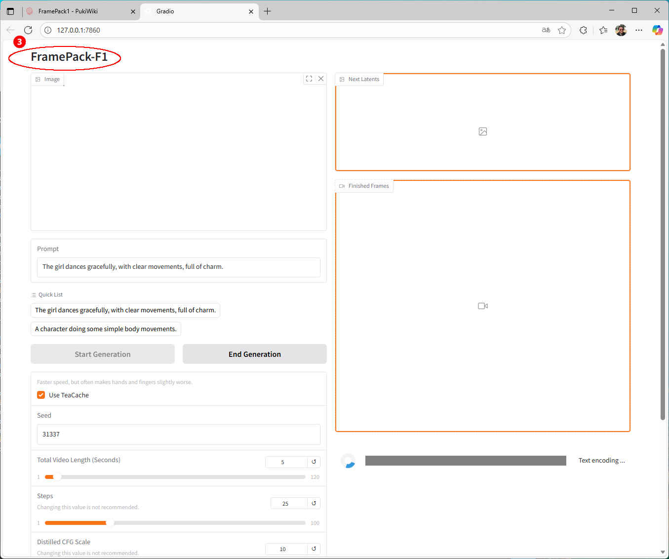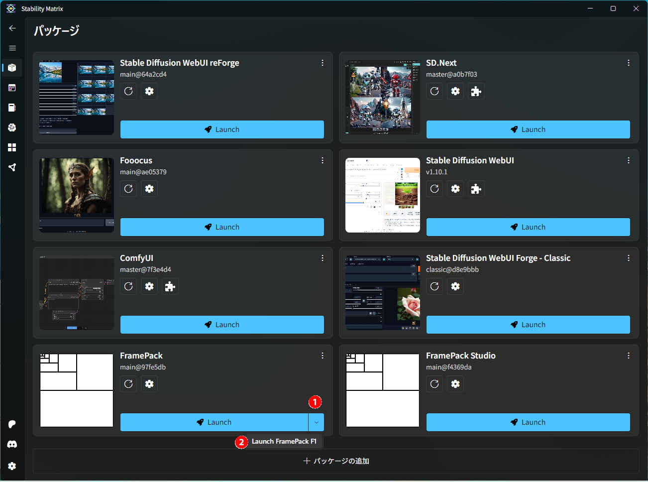 ・起動ボタンの選択で「FramePack」/ 「FramePack」F! を切り替えることができる