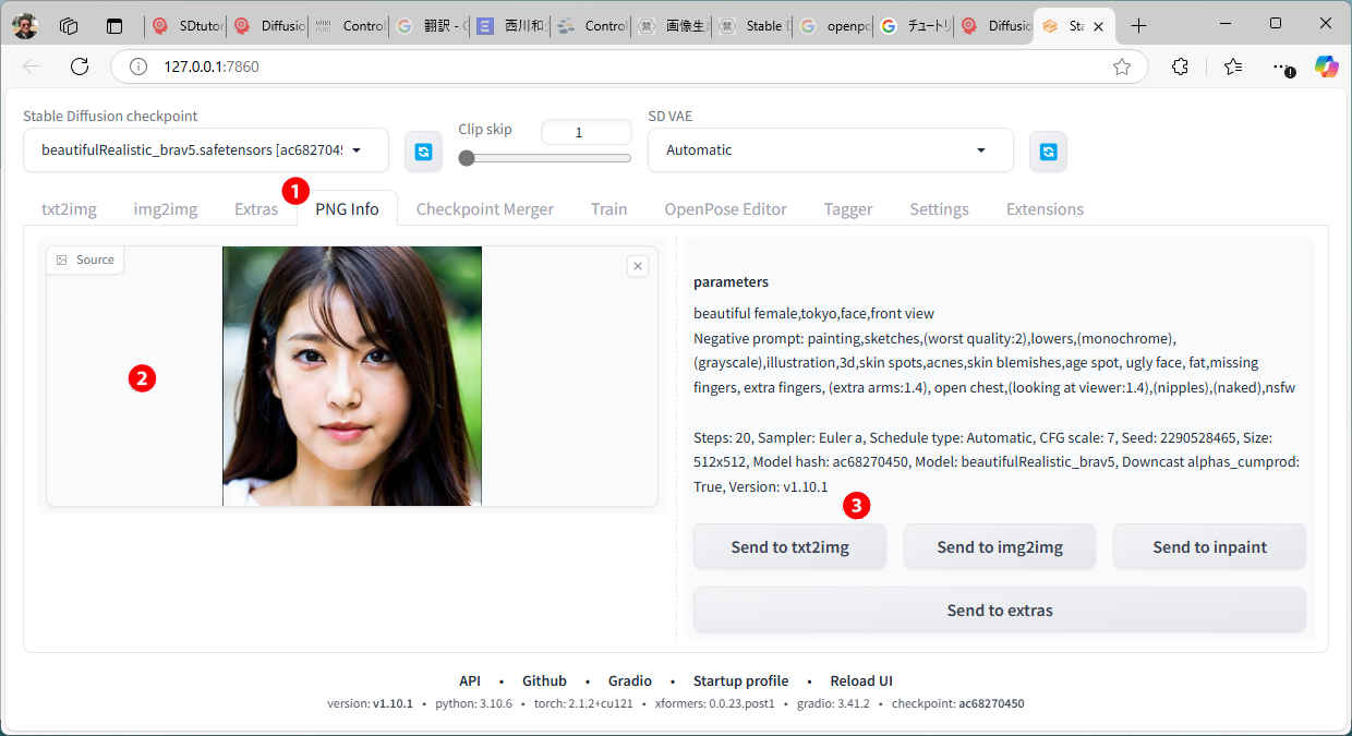 - 生成画像から情報を得る「PNG info」は「v1.10」「v1.6」どちらの画像も使用できます