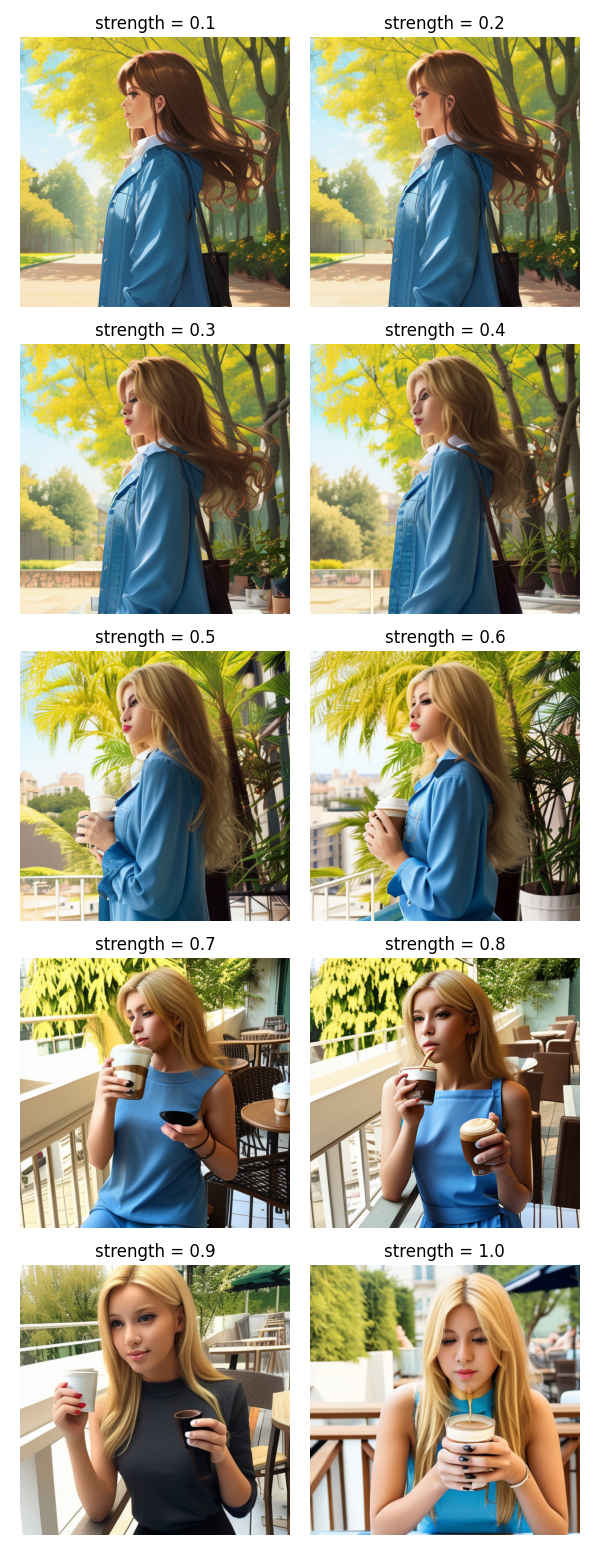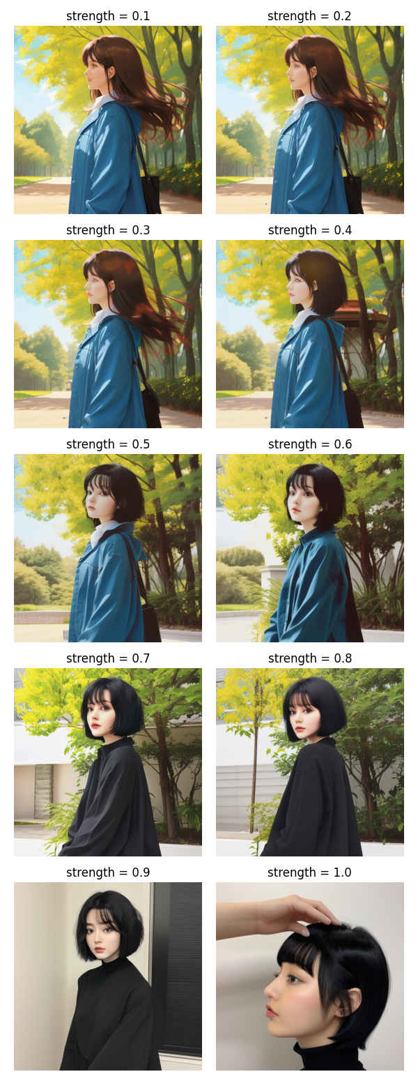 ## sd_031.py 画像から画像生成 strength 強さを表すパラメータ ## model: beautifulRealistic_brav5.safetensors import torch from PIL import Image from diffusers import StableDiffusionImg2ImgPipeline,DPMSolverMultistepScheduler, logging from translate import Translator import matplotlib.pyplot as plt import sd_tools as sdt logging.set_verbosity_error() # 画像生成 def image_generation(strength): # パイプラインを作成 pipeline = StableDiffusionImg2ImgPipeline.from_single_file( model_path, torch_dtype = torch.float16, ).to(device) # スケジューラ設定 pipeline.scheduler = DPMSolverMultistepScheduler.from_config(pipeline.scheduler.config) # Generatorオブジェクト作成 generator = torch.Generator(device).manual_seed(seed) # 画像を生成 img = pipeline( prompt = prompt, image = src_image, num_inference_steps = 30, guidance_scale = 7, strength = strength, generator = generator ).images[0] return img # モデルフォルダーのパス model_path = "/StabilityMatrix/Data/Models/StableDiffusion/SD1.5/beautifulRealistic_brav5.safetensors" image_path = "images/StableDiffusion_247.png" # GPUを使う場合は"cuda" 使わない場合は"cpu" device = 'cuda' if torch.cuda.is_available() else 'cpu' # seed 値 seed = 12345678 # プロンプト trans = Translator('en','ja').translate prompt_jp = '黒髪で短い髪の女性' #prompt_jp = 'テラスでコーヒーを飲む金髪の女性' prompt = trans(prompt_jp) src_image = Image.open(image_path) print(f'Seed: {seed}, Model: {model_path}') print(f'prompt : {prompt_jp} → {prompt}') # 複数画像を生成 plt.figure(figsize = [6, 15.5], dpi = 100) for i in range(10): strength = 0.1 + i * 0.1 img = image_generation(strength) plt.subplot(5, 2, i + 1, title = "strength = %.1f" % strength) plt.imshow(img) plt.axis('off') # メモリー開放 if device == 'cuda': torch.cuda.empty_cache() elif device == 'mps': torch.mps.empty_cache() plt.tight_layout() save_path = 'results/image_031.png' plt.savefig(save_path) plt.close() sdt.image_disp(save_path, save_path)