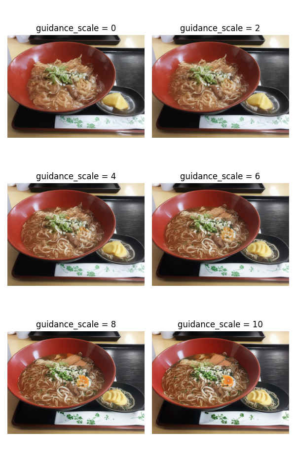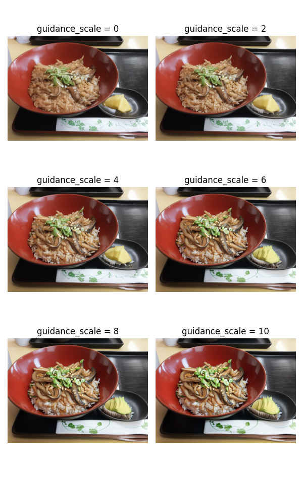 ## sd_032.py 画像から画像生成 プロンプトの重要度(guidance_scale) ## model: beautifulRealistic_brav5.safetensors import torch from PIL import Image from diffusers import StableDiffusionImg2ImgPipeline,DPMSolverMultistepScheduler, logging from translate import Translator import matplotlib.pyplot as plt import sd_tools as sdt logging.set_verbosity_error() # 画像生成 def image_generation(g_scale): # パイプラインを作成 pipeline = StableDiffusionImg2ImgPipeline.from_single_file( model_path, torch_dtype = torch.float16, ).to(device) # スケジューラ設定 pipeline.scheduler = DPMSolverMultistepScheduler.from_config(pipeline.scheduler.config) # Generatorオブジェクト作成 generator = torch.Generator(device).manual_seed(seed) # 画像を生成 img = pipeline( prompt = prompt, image = src_image, num_inference_steps = 30, guidance_scale = g_scale, strength = 0.5, generator = generator ).images[0] return img # モデルフォルダーのパス model_path = "/StabilityMatrix/Data/Models/StableDiffusion/SD1.5/beautifulRealistic_brav5.safetensors" image_path = "images/kaisendon.jpg" # GPUを使う場合は"cuda" 使わない場合は"cpu" device = 'cuda' if torch.cuda.is_available() else 'cpu' # seed 値 seed = 12345678 # プロンプト trans = Translator('en','ja').translate prompt_jp = 'ラーメン' #prompt_jp = '鰻丼' prompt = trans(prompt_jp) src_image = Image.open(image_path) print(f'Seed: {seed}, Model: {model_path}') print(f'prompt : {prompt_jp} → {prompt}') # 複数画像を生成 plt.figure(figsize = [6, 9.5], dpi = 100) for i in range(6): img = image_generation(i * 2) plt.subplot(3, 2, i + 1, title = 'guidance_scale = %d' % (i * 2)) plt.imshow(img) plt.axis('off') # メモリー開放 if device == 'cuda': torch.cuda.empty_cache() elif device == 'mps': torch.mps.empty_cache() plt.tight_layout() save_path = 'results/image_032.png' plt.savefig(save_path) plt.close() sdt.image_disp(save_path, save_path)