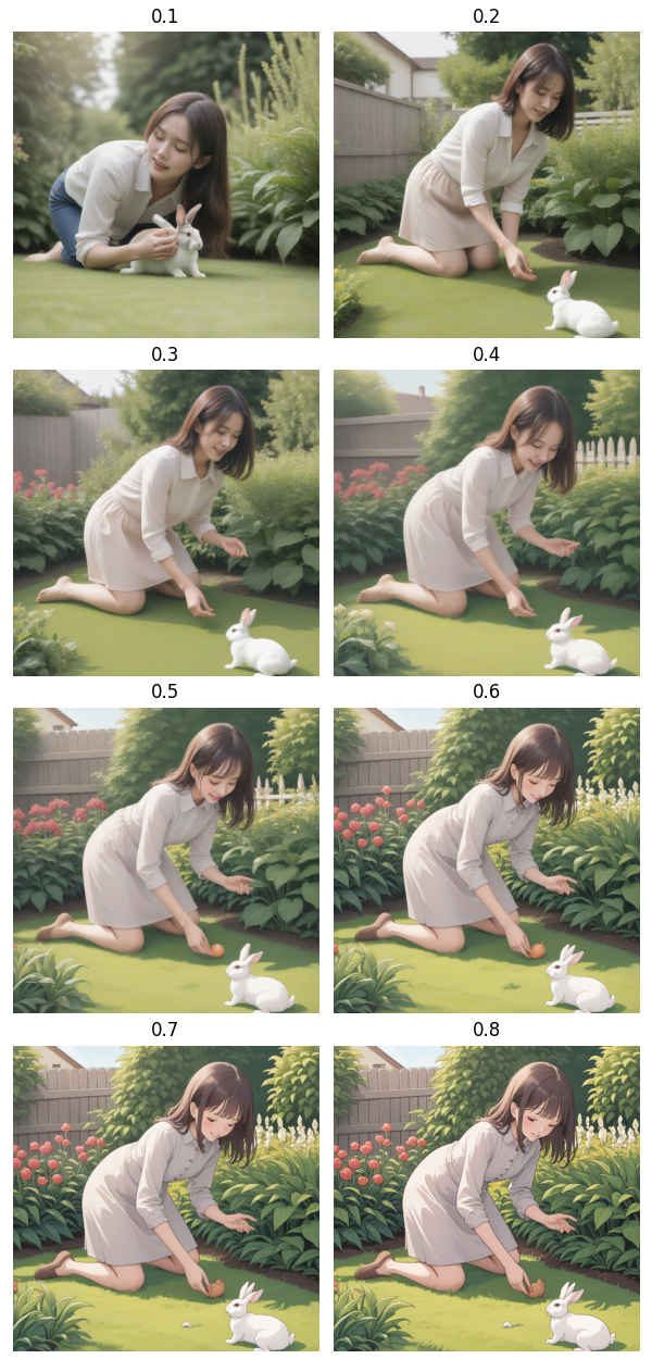 ## sd_034.py【SDXL】モデル合成(refiner)2 パラメータ比較 ## model: animexlXuebimix_v60LCM.safetensors ## fudukiMix_v20.safetensors import torch from PIL import Image from diffusers import StableDiffusionXLPipeline, StableDiffusionXLImg2ImgPipeline, EulerAncestralDiscreteScheduler, logging from translate import Translator import matplotlib.pyplot as plt import sd_tools as sdt logging.set_verbosity_error() # 画像生成 def image_generation(sep): # ベースモデルのパイプライン pipe_base = StableDiffusionXLPipeline.from_single_file( model_base_path, torch_dtype = torch.float16 ).to(device) # スケジューラー設定 pipe_base.scheduler = EulerAncestralDiscreteScheduler.from_config(pipe_base.scheduler.config) # リファイナーモデルのパイプライン pipe_ref = StableDiffusionXLImg2ImgPipeline.from_single_file( model_ref_path, torch_dtype = torch.float16, scheduler = pipe_base.scheduler # スケジューラーを統一 ).to(device) # Generatorオブジェクト作成 generator = torch.Generator(device).manual_seed(seed) # ベースモデルで画像生成 img0 = pipe_base( prompt, num_inference_steps = 20, generator = generator, denoising_end = sep, # 途中で生成をやめると指定 output_type = 'latent' # 出力を潜在空間と指定 ).images # リファイナーモデルで画像生成 img = pipe_ref( prompt, image = img0, num_inference_steps = 20, generator = generator, denoising_start = sep, # 生成を途中から続けると指定 ).images[0] return img # モデルフォルダーのパス model_base_path = "/StabilityMatrix/Data/Models/StableDiffusion/animexlXuebimix_v60LCM.safetensors" model_ref_path = "/StabilityMatrix/Data/Models/StableDiffusion/fudukiMix_v20.safetensors" # GPUを使う場合は"cuda" 使わない場合は"cpu" device = 'cuda' if torch.cuda.is_available() else 'cpu' # seed 値 seed = 12345678 # プロンプト trans = Translator('en','ja').translate prompt_jp = '庭で兎と遊んでいる女性' prompt = trans(prompt_jp) print(f'Seed: {seed}') print(f'Model1: {model_base_path}') print(f'Model2: {model_ref_path}') print(f'prompt : {prompt_jp} → {prompt}') # 複数画像を生成 plt.figure(figsize = [6, 12.5], dpi = 100) for i in range(8): sep = 0.1 + 0.1 * i img = image_generation(sep) plt.subplot(4, 2, i + 1, title = '%.1f' % sep) plt.imshow(img) plt.axis('off') # メモリー開放 if device == 'cuda': torch.cuda.empty_cache() elif device == 'mps': torch.mps.empty_cache() plt.tight_layout(pad = 0.5) save_path = 'results/image_034.png' plt.savefig(save_path) plt.close() sdt.image_disp(save_path, save_path)