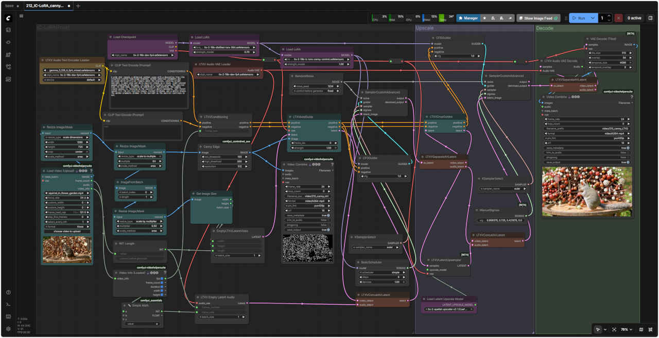 IC-LoRA (Canny) は、エッジの 制御信号から動画を作る。text2video のワークフローに ControlNet のような制御用の動画入力を追加する