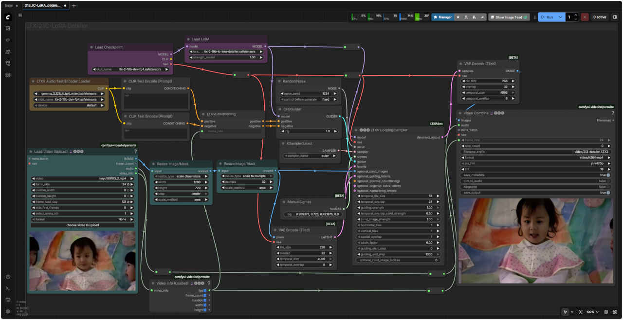複数 IC-LoRA を重ねることはできないが image2video や audio2videoと組み合わせるができる。入力画像は 1フレーム目として固定される