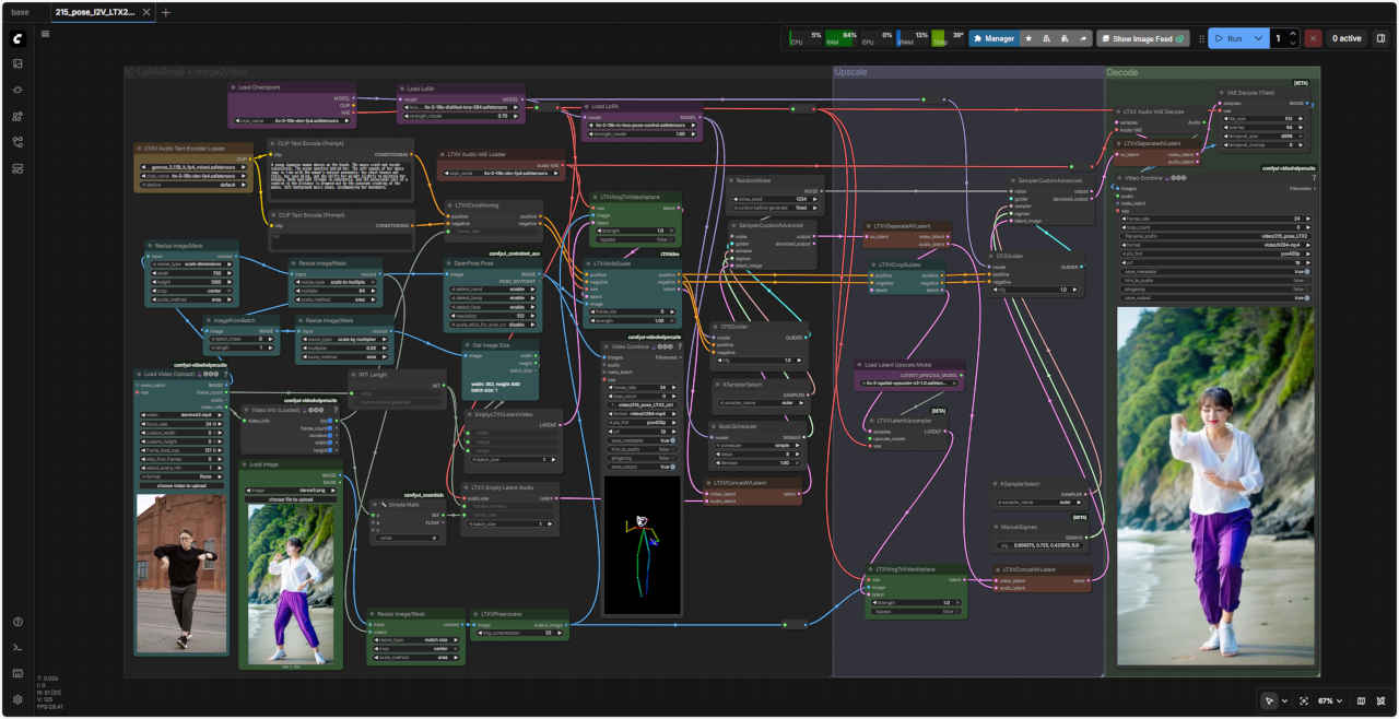 IC-LoRA (Pose) は、ポーズの 制御信号から動画を作る。text2video のワークフローに ControlNet のような制御用の動画入力を追加する