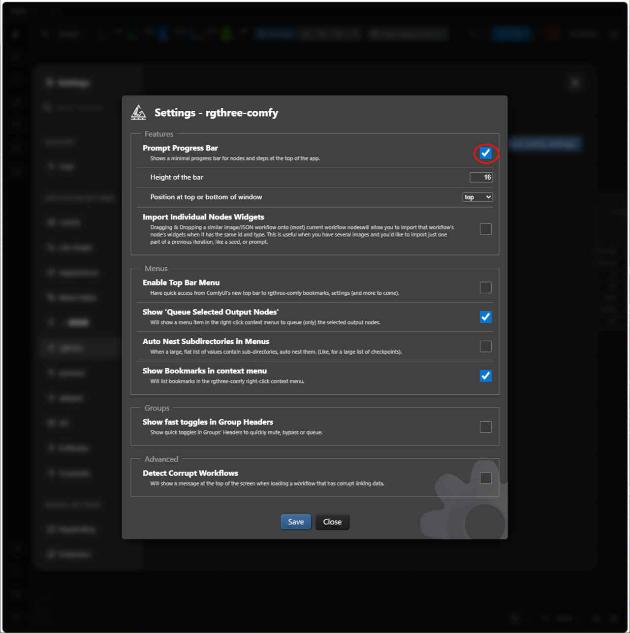 :「Prompt Progres Bar」の項目をチェックすると画面上部にworkflow全体における進行度と、そのノード内での進行度の二つが表示される