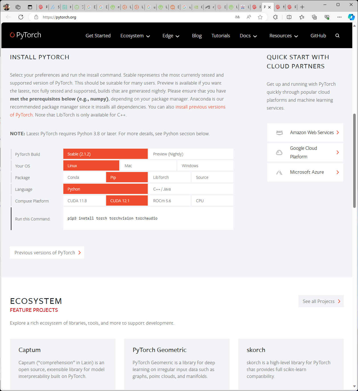(py311) $ pip install torch torchvision torchaudio Collecting torch Downloading torch-2.1.2-cp311-cp311-manylinux1_x86_64.whl.metadata (25 kB) Collecting torchvision Downloading torchvision-0.16.2-cp311-cp311-manylinux1_x86_64.whl.metadata (6.6 kB) Collecting torchaudio Downloading torchaudio-2.1.2-cp311-cp311-manylinux1_x86_64.whl.metadata (6.4 kB) Collecting filelock (from torch) Downloading filelock-3.13.1-py3-none-any.whl.metadata (2.8 kB) Collecting typing-extensions (from torch) Downloading typing_extensions-4.9.0-py3-none-any.whl.metadata (3.0 kB) Collecting sympy (from torch) Downloading sympy-1.12-py3-none-any.whl (5.7 MB) ━━━━━━━━━━━━━━━━━━━━━━━━━━━━━━━━━━━━━━━━ 5.7/5.7 MB 37.6 MB/s eta 0:00:00 Collecting networkx (from torch) Downloading networkx-3.2.1-py3-none-any.whl.metadata (5.2 kB) Collecting jinja2 (from torch) Downloading Jinja2-3.1.3-py3-none-any.whl.metadata (3.3 kB) Collecting fsspec (from torch) Downloading fsspec-2023.12.2-py3-none-any.whl.metadata (6.8 kB) Collecting nvidia-cuda-nvrtc-cu12==12.1.105 (from torch) Downloading nvidia_cuda_nvrtc_cu12-12.1.105-py3-none-manylinux1_x86_64.whl (23.7 MB) ━━━━━━━━━━━━━━━━━━━━━━━━━━━━━━━━━━━━━━━━ 23.7/23.7 MB 49.3 MB/s eta 0:00:00 Collecting nvidia-cuda-runtime-cu12==12.1.105 (from torch) Downloading nvidia_cuda_runtime_cu12-12.1.105-py3-none-manylinux1_x86_64.whl (823 kB) ━━━━━━━━━━━━━━━━━━━━━━━━━━━━━━━━━━━━━━━━ 823.6/823.6 kB 50.9 MB/s eta 0:00:00 Collecting nvidia-cuda-cupti-cu12==12.1.105 (from torch) Downloading nvidia_cuda_cupti_cu12-12.1.105-py3-none-manylinux1_x86_64.whl (14.1 MB) ━━━━━━━━━━━━━━━━━━━━━━━━━━━━━━━━━━━━━━━━ 14.1/14.1 MB 57.5 MB/s eta 0:00:00 Collecting nvidia-cudnn-cu12==8.9.2.26 (from torch) Downloading nvidia_cudnn_cu12-8.9.2.26-py3-none-manylinux1_x86_64.whl.metadata (1.6 kB) Collecting nvidia-cublas-cu12==12.1.3.1 (from torch) Downloading nvidia_cublas_cu12-12.1.3.1-py3-none-manylinux1_x86_64.whl (410.6 MB) ━━━━━━━━━━━━━━━━━━━━━━━━━━━━━━━━━━━━━━━━ 410.6/410.6 MB 7.6 MB/s eta 0:00:00 Collecting nvidia-cufft-cu12==11.0.2.54 (from torch) Downloading nvidia_cufft_cu12-11.0.2.54-py3-none-manylinux1_x86_64.whl (121.6 MB) ━━━━━━━━━━━━━━━━━━━━━━━━━━━━━━━━━━━━━━━━ 121.6/121.6 MB 19.7 MB/s eta 0:00:00 Collecting nvidia-curand-cu12==10.3.2.106 (from torch) Downloading nvidia_curand_cu12-10.3.2.106-py3-none-manylinux1_x86_64.whl (56.5 MB) ━━━━━━━━━━━━━━━━━━━━━━━━━━━━━━━━━━━━━━━━ 56.5/56.5 MB 26.0 MB/s eta 0:00:00 Collecting nvidia-cusolver-cu12==11.4.5.107 (from torch) Downloading nvidia_cusolver_cu12-11.4.5.107-py3-none-manylinux1_x86_64.whl (124.2 MB) ━━━━━━━━━━━━━━━━━━━━━━━━━━━━━━━━━━━━━━━━ 124.2/124.2 MB 19.1 MB/s eta 0:00:00 Collecting nvidia-cusparse-cu12==12.1.0.106 (from torch) Downloading nvidia_cusparse_cu12-12.1.0.106-py3-none-manylinux1_x86_64.whl (196.0 MB) ━━━━━━━━━━━━━━━━━━━━━━━━━━━━━━━━━━━━━━━━ 196.0/196.0 MB 13.8 MB/s eta 0:00:00 Collecting nvidia-nccl-cu12==2.18.1 (from torch) Downloading nvidia_nccl_cu12-2.18.1-py3-none-manylinux1_x86_64.whl (209.8 MB) ━━━━━━━━━━━━━━━━━━━━━━━━━━━━━━━━━━━━━━━━ 209.8/209.8 MB 12.7 MB/s eta 0:00:00 Collecting nvidia-nvtx-cu12==12.1.105 (from torch) Downloading nvidia_nvtx_cu12-12.1.105-py3-none-manylinux1_x86_64.whl (99 kB) ━━━━━━━━━━━━━━━━━━━━━━━━━━━━━━━━━━━━━━━━ 99.1/99.1 kB 12.7 MB/s eta 0:00:00 Collecting triton==2.1.0 (from torch) Downloading triton-2.1.0-0-cp311-cp311-manylinux2014_x86_64.manylinux_2_17_x86_64.whl.metadata (1.3 kB) Collecting nvidia-nvjitlink-cu12 (from nvidia-cusolver-cu12==11.4.5.107->torch) Downloading nvidia_nvjitlink_cu12-12.3.101-py3-none-manylinux1_x86_64.whl.metadata (1.5 kB) Collecting numpy (from torchvision) Downloading numpy-1.26.3-cp311-cp311-manylinux_2_17_x86_64.manylinux2014_x86_64.whl.metadata (61 kB) ━━━━━━━━━━━━━━━━━━━━━━━━━━━━━━━━━━━━━━━━ 61.2/61.2 kB 7.9 MB/s eta 0:00:00 Collecting requests (from torchvision) Downloading requests-2.31.0-py3-none-any.whl.metadata (4.6 kB) Collecting pillow!=8.3.*,>=5.3.0 (from torchvision) Downloading pillow-10.2.0-cp311-cp311-manylinux_2_28_x86_64.whl.metadata (9.7 kB) Collecting MarkupSafe>=2.0 (from jinja2->torch) Downloading MarkupSafe-2.1.3-cp311-cp311-manylinux_2_17_x86_64.manylinux2014_x86_64.whl.metadata (3.0 kB) Collecting charset-normalizer<4,>=2 (from requests->torchvision) Downloading charset_normalizer-3.3.2-cp311-cp311-manylinux_2_17_x86_64.manylinux2014_x86_64.whl.metadata (33 kB) Collecting idna<4,>=2.5 (from requests->torchvision) Downloading idna-3.6-py3-none-any.whl.metadata (9.9 kB) Collecting urllib3<3,>=1.21.1 (from requests->torchvision) Downloading urllib3-2.1.0-py3-none-any.whl.metadata (6.4 kB) Collecting certifi>=2017.4.17 (from requests->torchvision) Downloading certifi-2023.11.17-py3-none-any.whl.metadata (2.2 kB) Collecting mpmath>=0.19 (from sympy->torch) Downloading mpmath-1.3.0-py3-none-any.whl (536 kB) ━━━━━━━━━━━━━━━━━━━━━━━━━━━━━━━━━━━━━━━━ 536.2/536.2 kB 45.4 MB/s eta 0:00:00 Downloading torch-2.1.2-cp311-cp311-manylinux1_x86_64.w