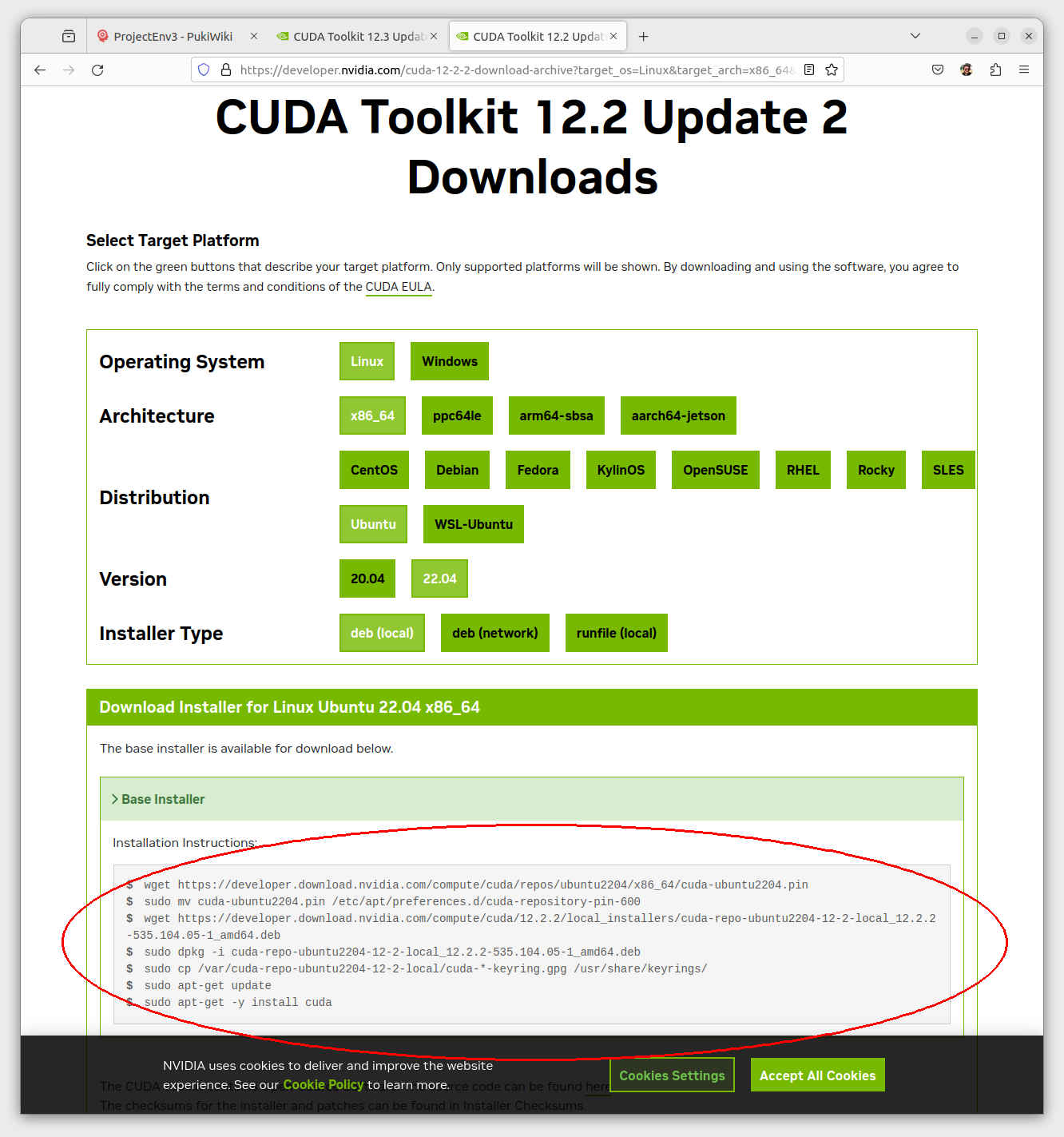 wget https://developer.download.nvidia.com/compute/cuda/repos/ubuntu2204/x86_64/cuda-ubuntu2204.pin sudo mv cuda-ubuntu2204.pin /etc/apt/preferences.d/cuda-repository-pin-600 wget https://developer.download.nvidia.com/compute/cuda/12.2.2/local_installers/cuda-repo-ubuntu2204-12-2-local_12.2.2-535.104.05-1_amd64.deb sudo dpkg -i cuda-repo-ubuntu2204-12-2-local_12.2.2-535.104.05-1_amd64.deb sudo cp /var/cuda-repo-ubuntu2204-12-2-local/cuda-*-keyring.gpg /usr/share/keyrings/ sudo apt-get update sudo apt-get -y install cuda