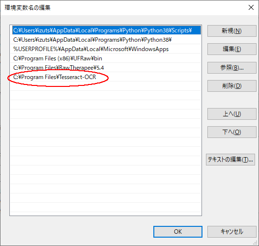 (base) PS > echo $env:Path C:\Users\USER\anaconda3;.................................;C:\Program Files\Tesseract-OCR;. (base) PS > echo $env:TESSDATA_PREFIX C:\Program Files\Tesseract-OCR\tessdata (base) PS > echo $env:PYTHONPATH C:\anaconda_win\workspace_py37\mylib