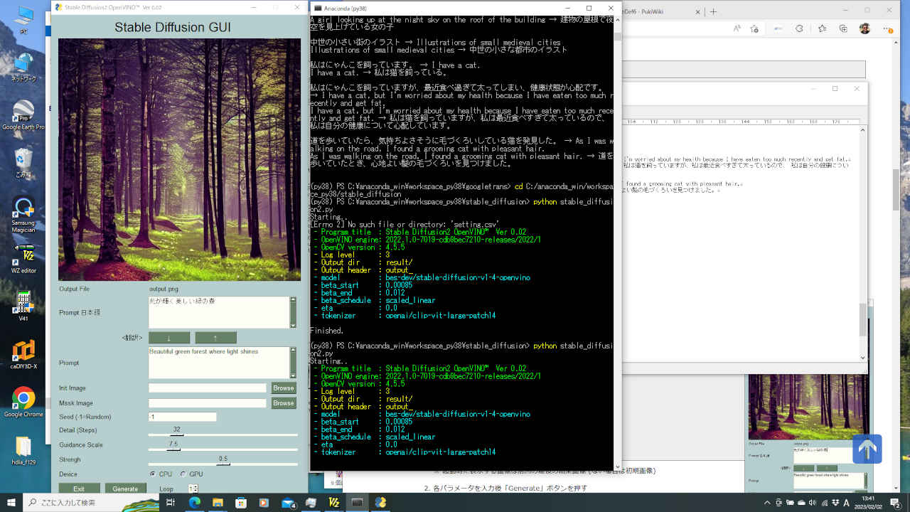 (py38a) PS > cd /anaconda_win/workspace_py38/stable_diffusion/ (py38a) PS > python stable_diffusion2.py Starting.. - Program title : Stable Diffusion2 OpenVINO™ Ver 0.03 : Prompt: Beautiful green forest where light shines (和訳): 光が輝く美しい緑の森 ** start 0 ** 799752338 32it [01:11, 2.24s/it] -Output-: result/output_0799752338.png ** end ** 00:01:35 Finished.