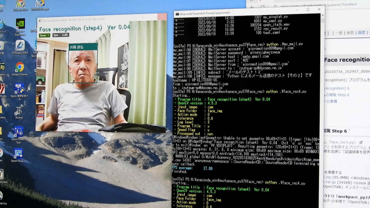 (py37y) PS > cd /aconda_win/workspace_py37/face_rec (py37y) PS > python face_rec1.py Starting.. - Program title : Face recognition (step1) Ver 0.02 : FPS average: 14.20 Finished.