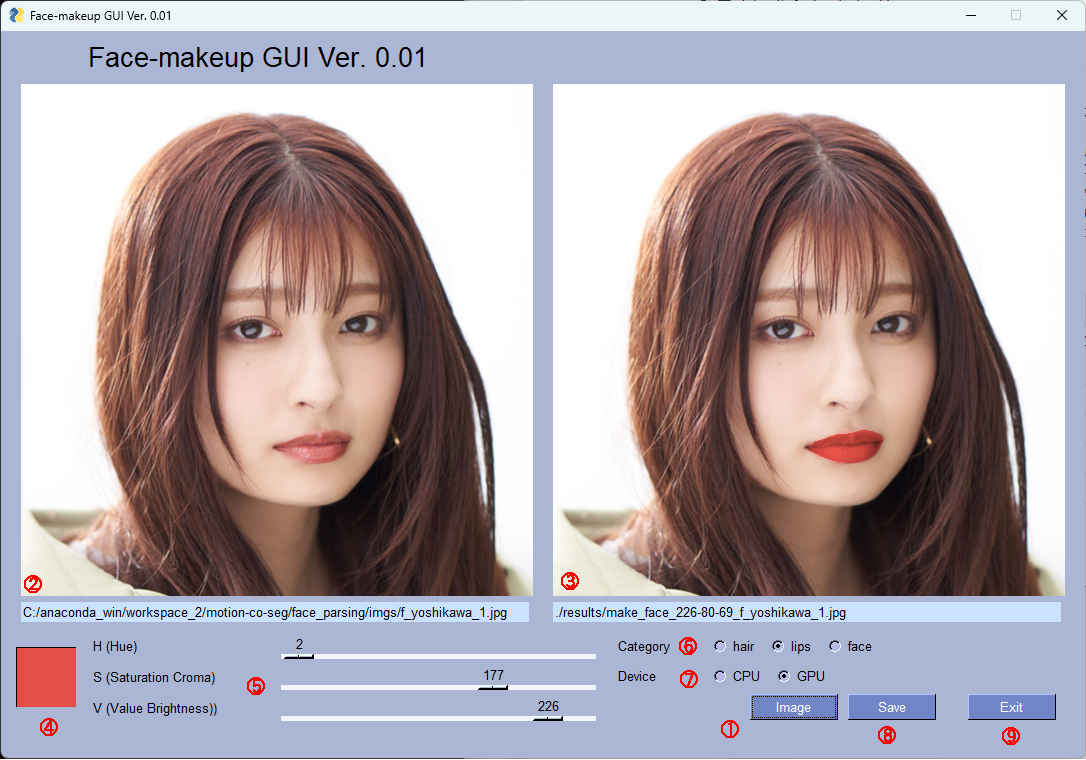 GUI で操作できるプログラム「makeup2.py」を作成