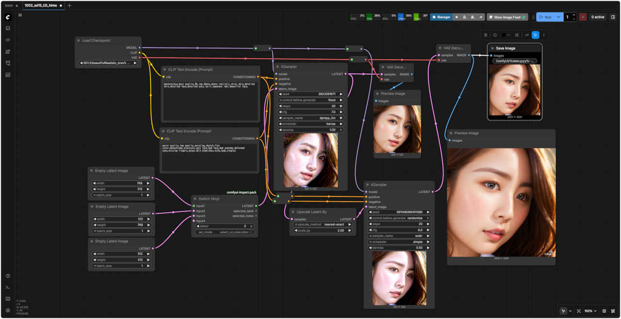 | ・基本的な「text to image」ワークフローに高解像度化を行うと Hires.fix を追加したワークフロー ・Hires.fix(High-Resolution Fix) は、生成された画像をもとにしてより高い解像度の画像を生成する技術 ・低解像度の画像に含まれる情報を元に AI が欠落している高周波成分(細部情報)を推論・補完することで高解像度化する ・単なる引き延ばしの拡大とは異なり画像の内部を理解することで補完する過程に AI による推論が行われている このような画像の拡大をアップスケール(高解像度化)という |