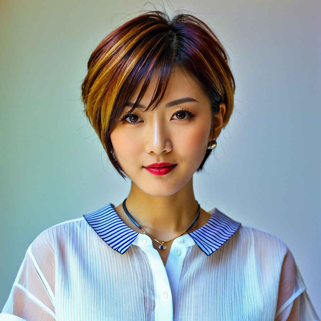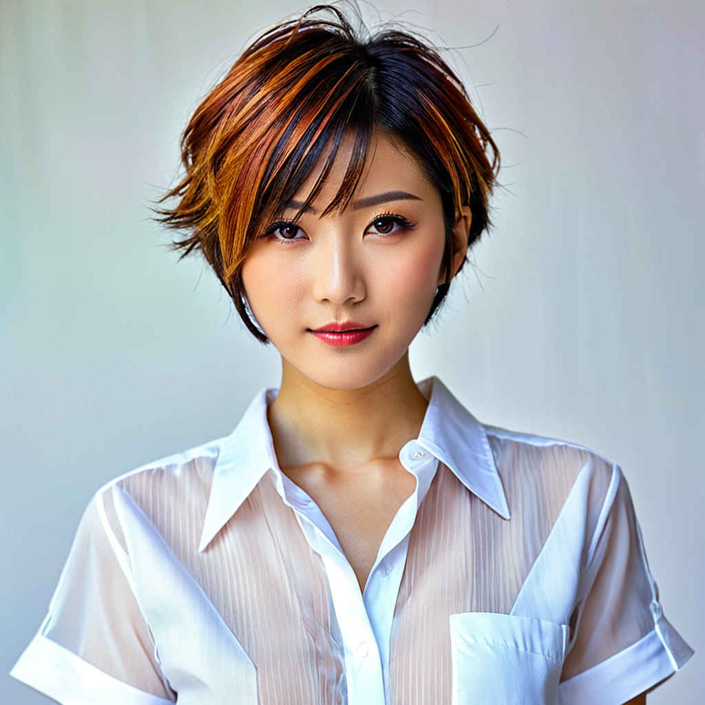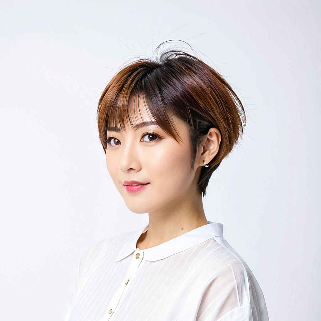 | ショートヘアで白いシャツを着た日本人女性が白い背景の前でポーズをとっている。完璧な顔立ち、人物像、精密さ | |