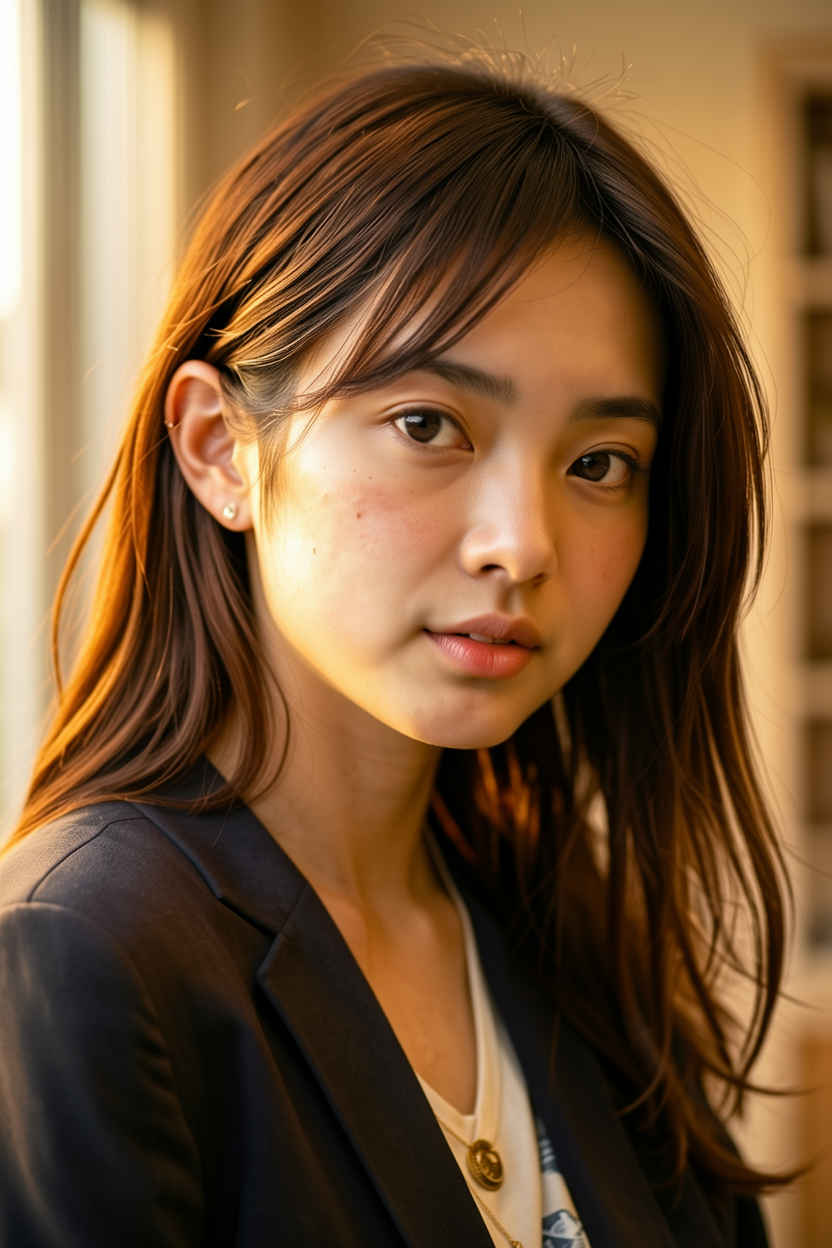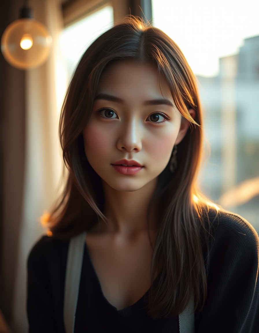 Close-up portrait of a Japanease young woman in her 20s, natural makeup, soft expression. 85mm lens, f/1.4, shallow depth of field, bokeh background. Soft window light from the left, golden hour glow, warm skin tones. Cinematic, realistic, high detail, professional photography. NOT: oversaturated, anime style, low resolution, distorted face. |