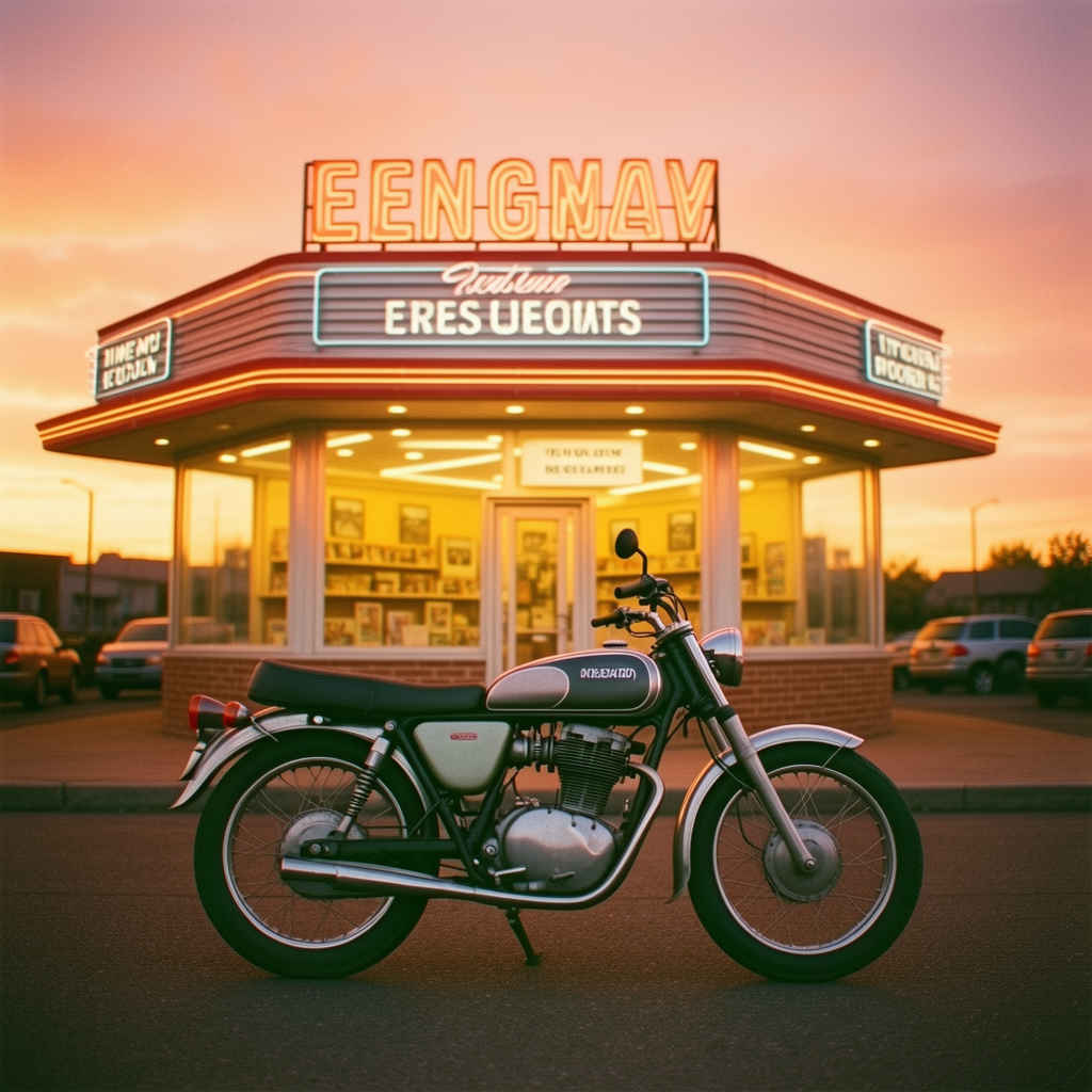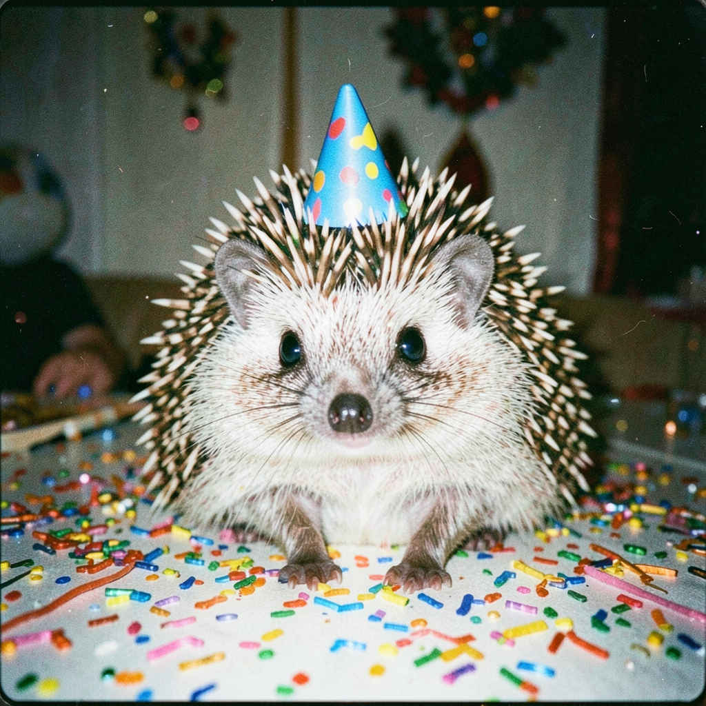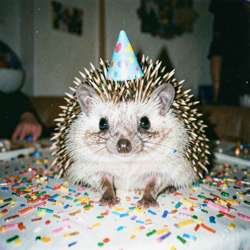 | A hedgehog wearing a tiny party hat surrounded by confetti, early digital camera style, slight noise, flash photography, candid moment, 2000s digicam aesthetic, festive birthday celebration atmosphere | A vintage motorcycle parked in front of a retro diner at sunset, warm orange and pink sky, neon signs glowing, 80s vintage photo style, film grain, warm color cast |
