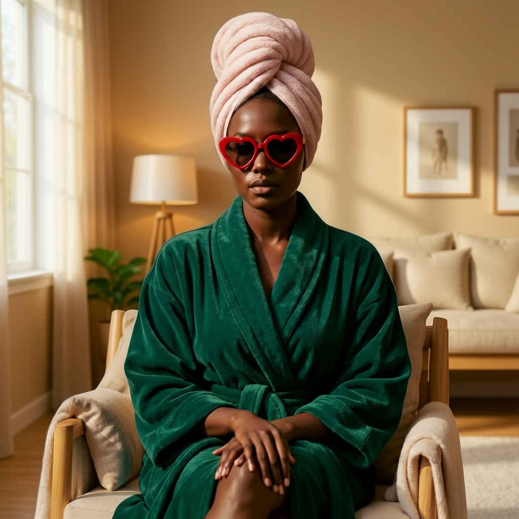 | 背景を、温かみのあるベージュトーンで、柔らかな自然光が差し込む、リラックスした親密な雰囲気の、居心地の良い室内空間に変更してください。これは、元の画像の雰囲気に似ています。人物の位置、サイズ、ポーズは元の写真と全く同じにしてください。カメラアングル、フレーミング、遠近法も元の写真と全く同じにしてください。照明は柔らかく、均一で、温かみのあるものにしてください。強すぎたり明るすぎたりしないようにしてください。部屋の環境だけを変更し、顔の特徴、髪型、表情、服装、ポーズはすべて元の写真と全く同じにしてください。 | 濃いエメラルドグリーンの豪華なバスローブ、淡いピンクのタオルターバン、赤いハート型のサングラスを身に着けた、肌の黒いスタイリッシュな若い女性が、柔らかなピンクのクッションが置かれた淡い色の籐椅子に座っている。椅子の前には、アーチ型のくぼみのある、質感のあるダスティローズピンクの壁があり、両側には幅広の濃い緑の葉を持つ大きな熱帯植物が植えられている。床には編み込みの麦わらかごが置かれている。背景にある靴はすべて取り除かれ、前景には女性のベージュの編み込みサンダルだけが見える。柔らかな自然光が優しい影を落とし、温かみのあるボヘミアンシックな美学が感じられる。プロのファッション写真。 |