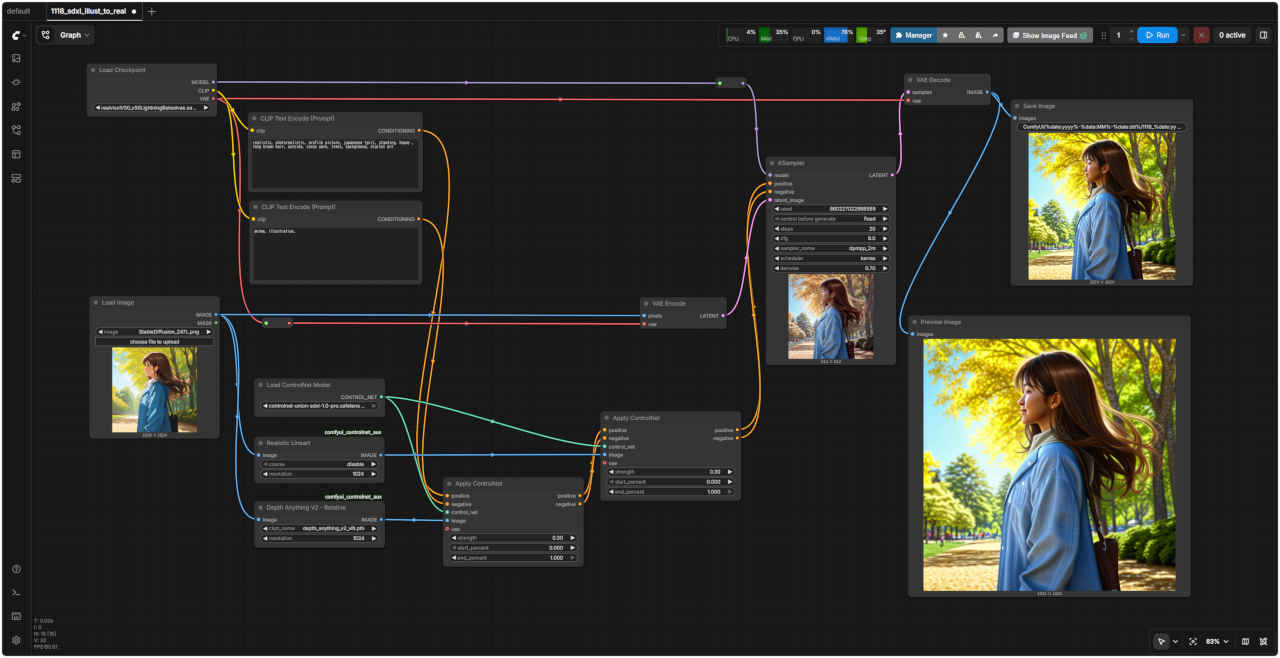 | アニメ調の参照画像を入力して、その詳細な特徴を反映した写実的な画像を img2img で生成する ControlNet の使用により、入力画像の構造が出力に強く反映され、同時にプロンプトとモデルの力を借りることで現実感のある詳細な描写が付加され、元のイラストに描写されている情報を保ちつつ、より写実的な画像が描かれることが期待できる |