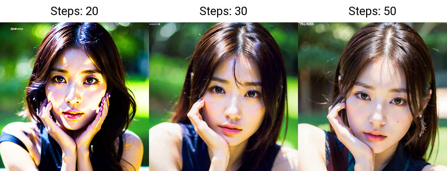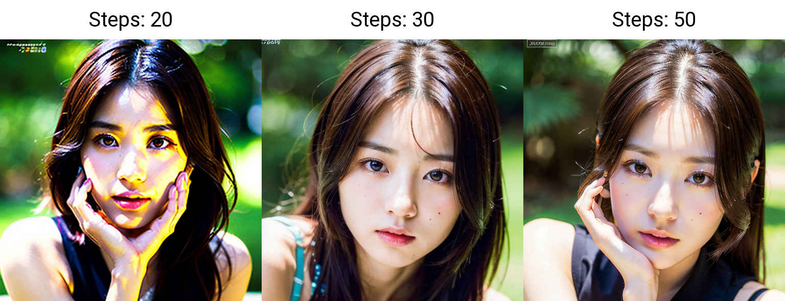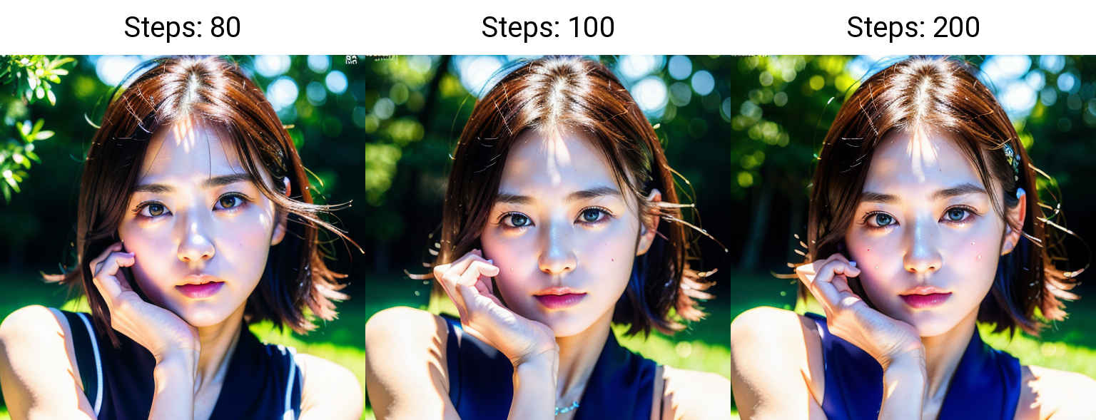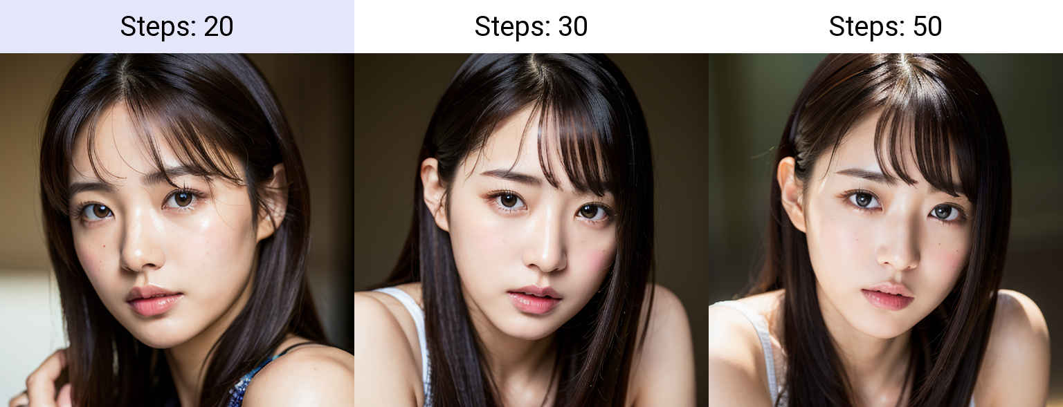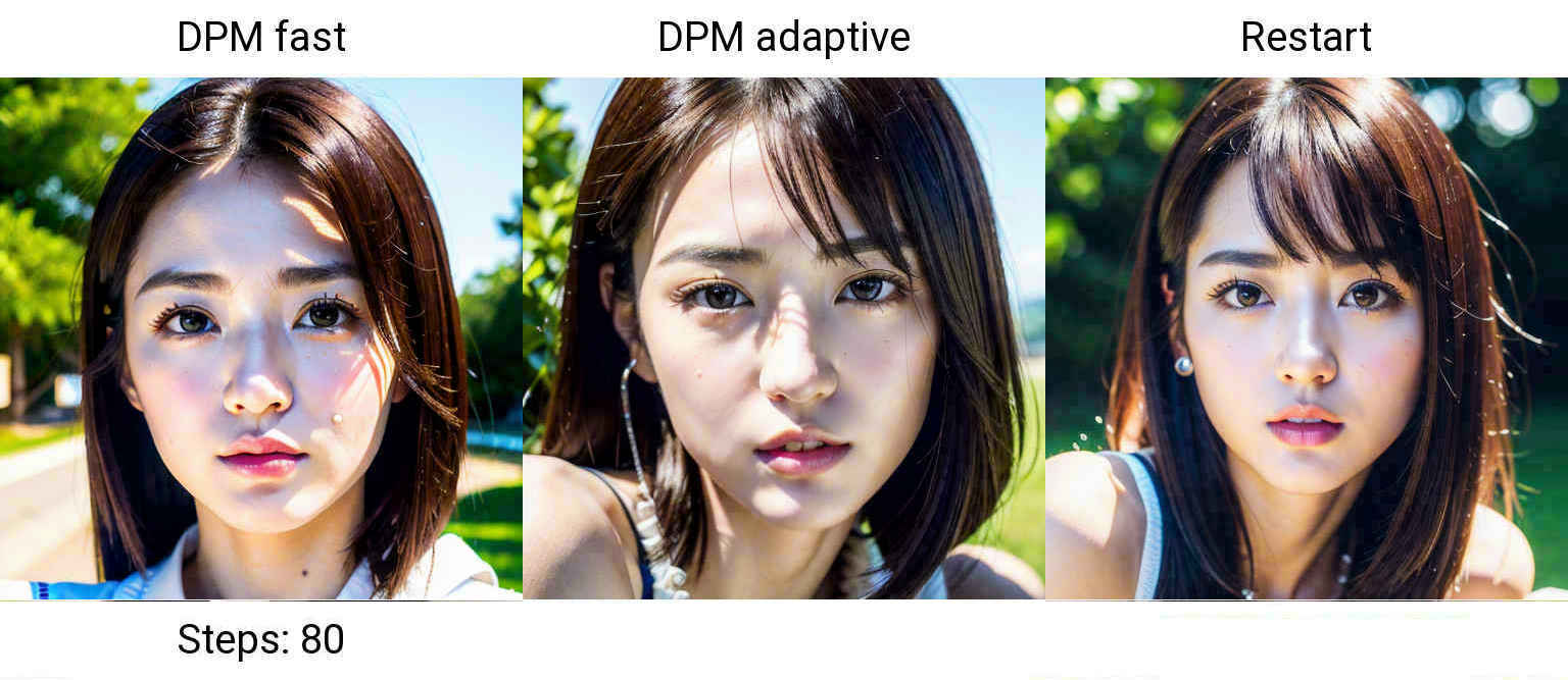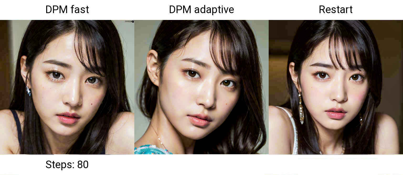 | DPM Adaptive | 状況に応じて適応的にサンプリングを行う 必要な箇所に焦点を当てた画像生成が可能となり、ディテールと速度のバランスを取ることができる | 30 〜 50 |