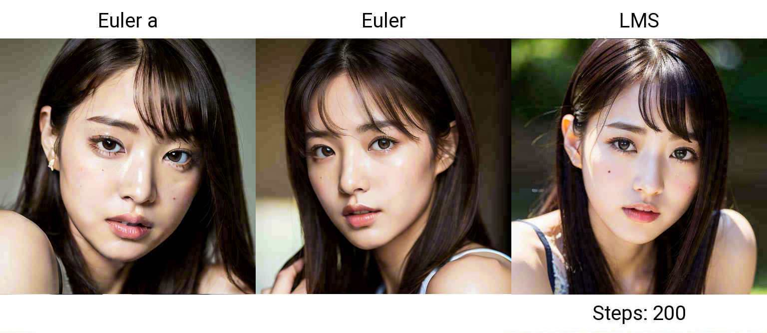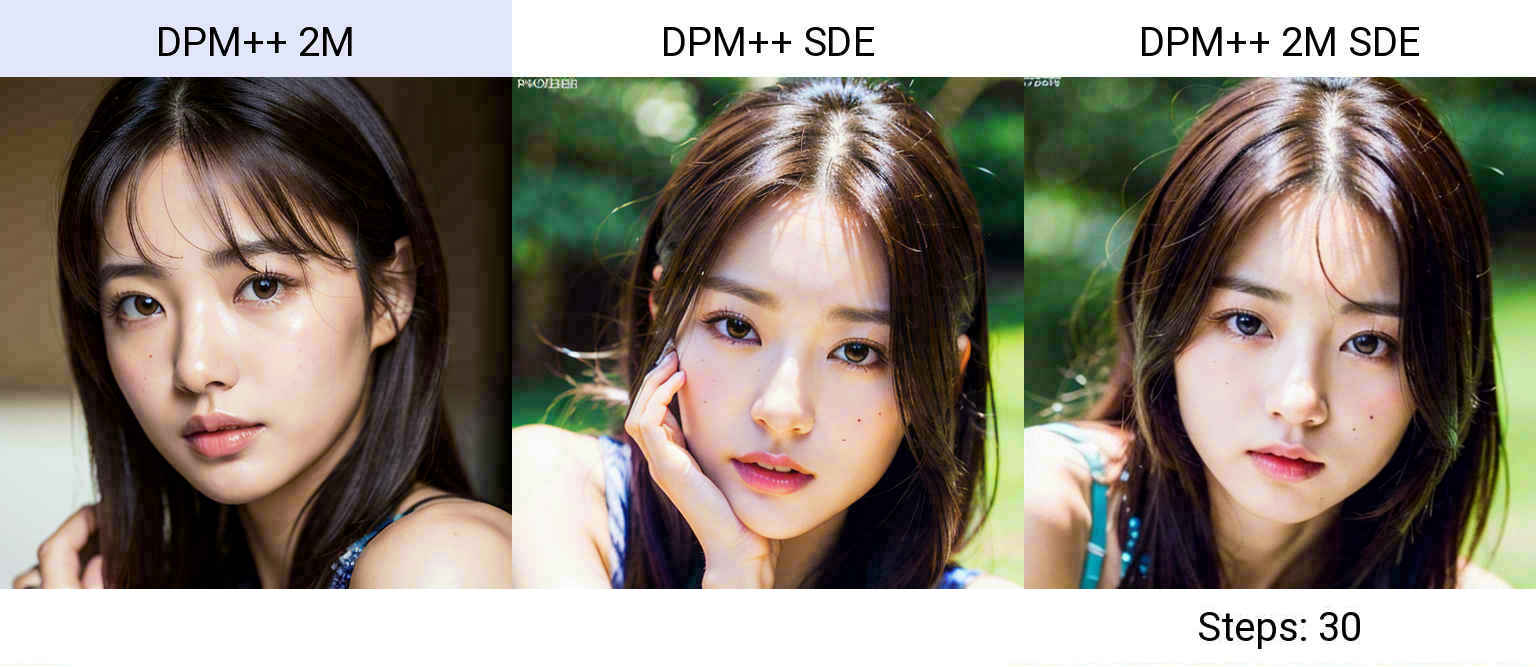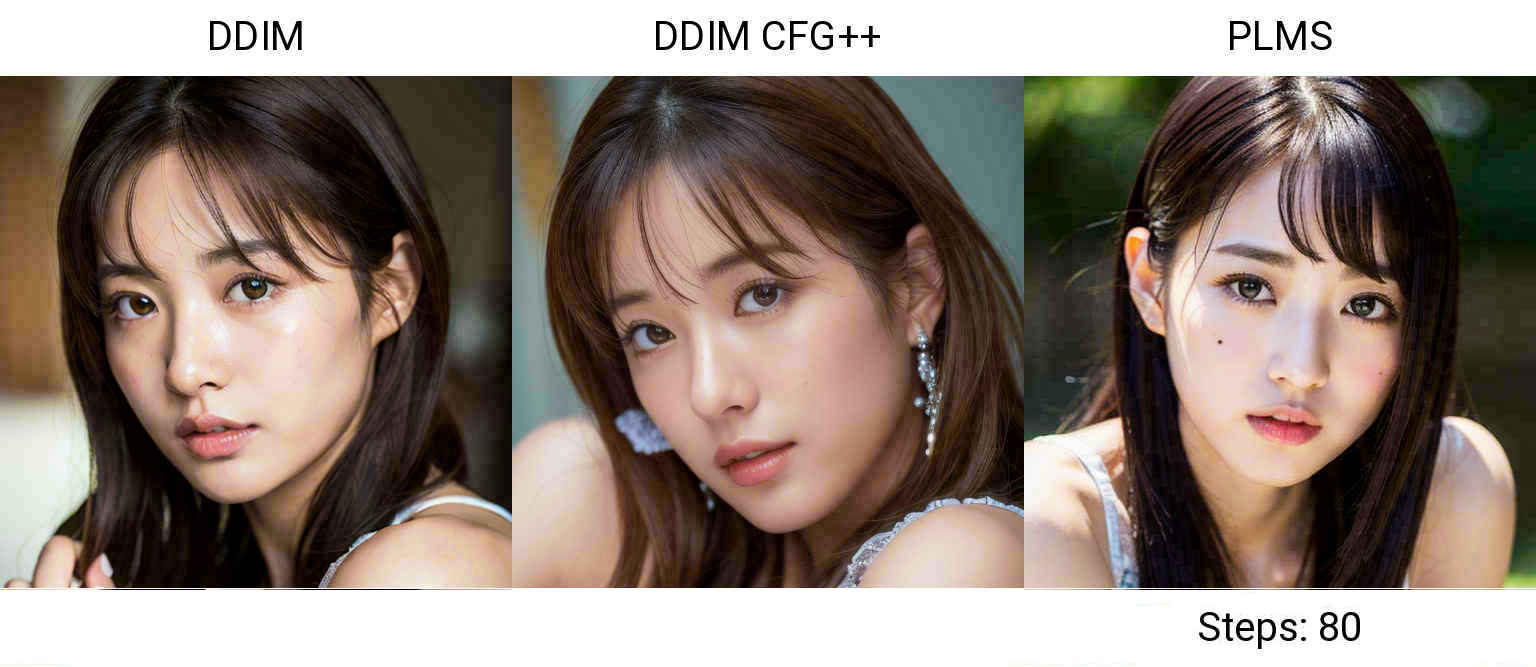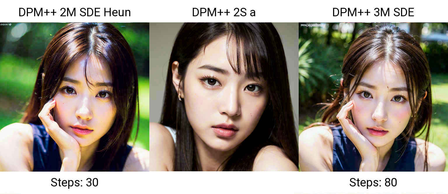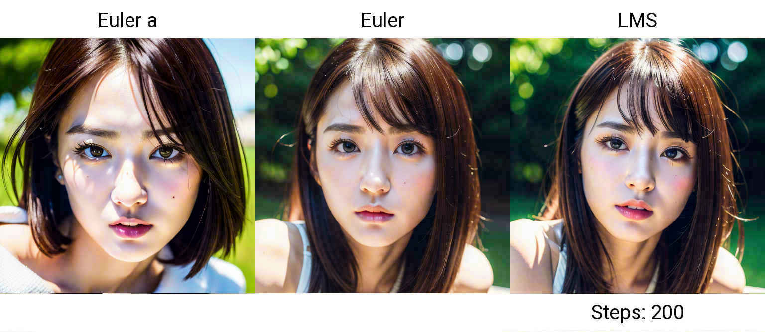 | ・DPM++ 2M SDE, DPM++ 2M SDE Heun, DPM++ 3M SDE, LMS, DPM fast, PLM,LCM デフォールト値では正常な生成ができないので 他のパラメータを調整する必要がある モデルによって差はあるがおおむね Steps 80~100 が適当 LMS の場合は回数を増やしたほうが結果は良い 80 ~ 200 |