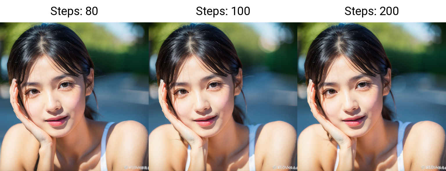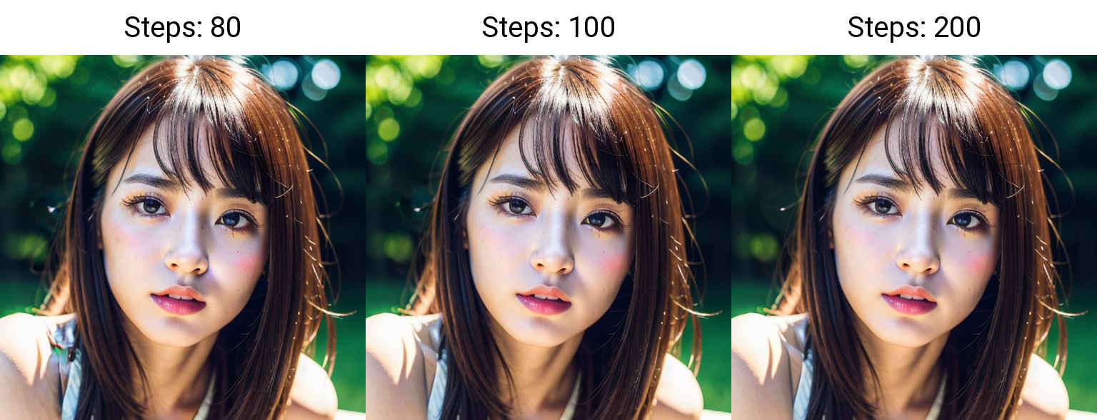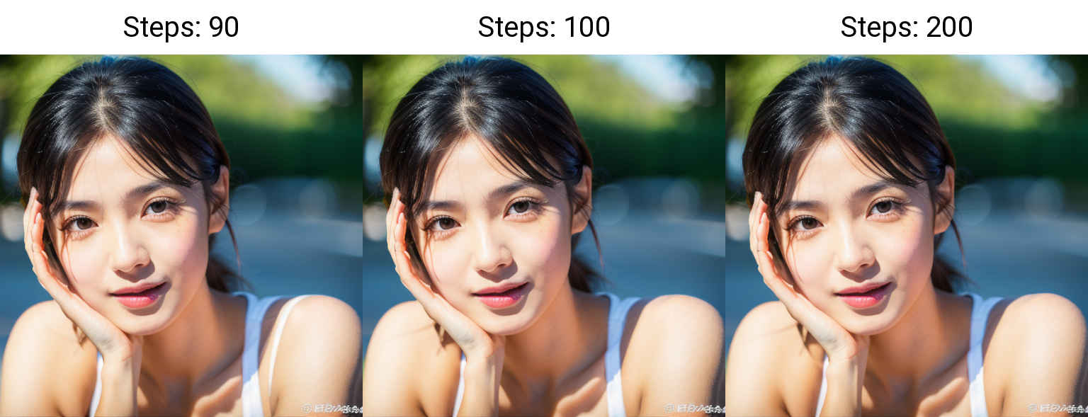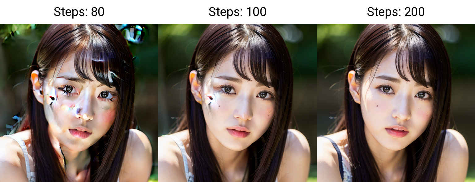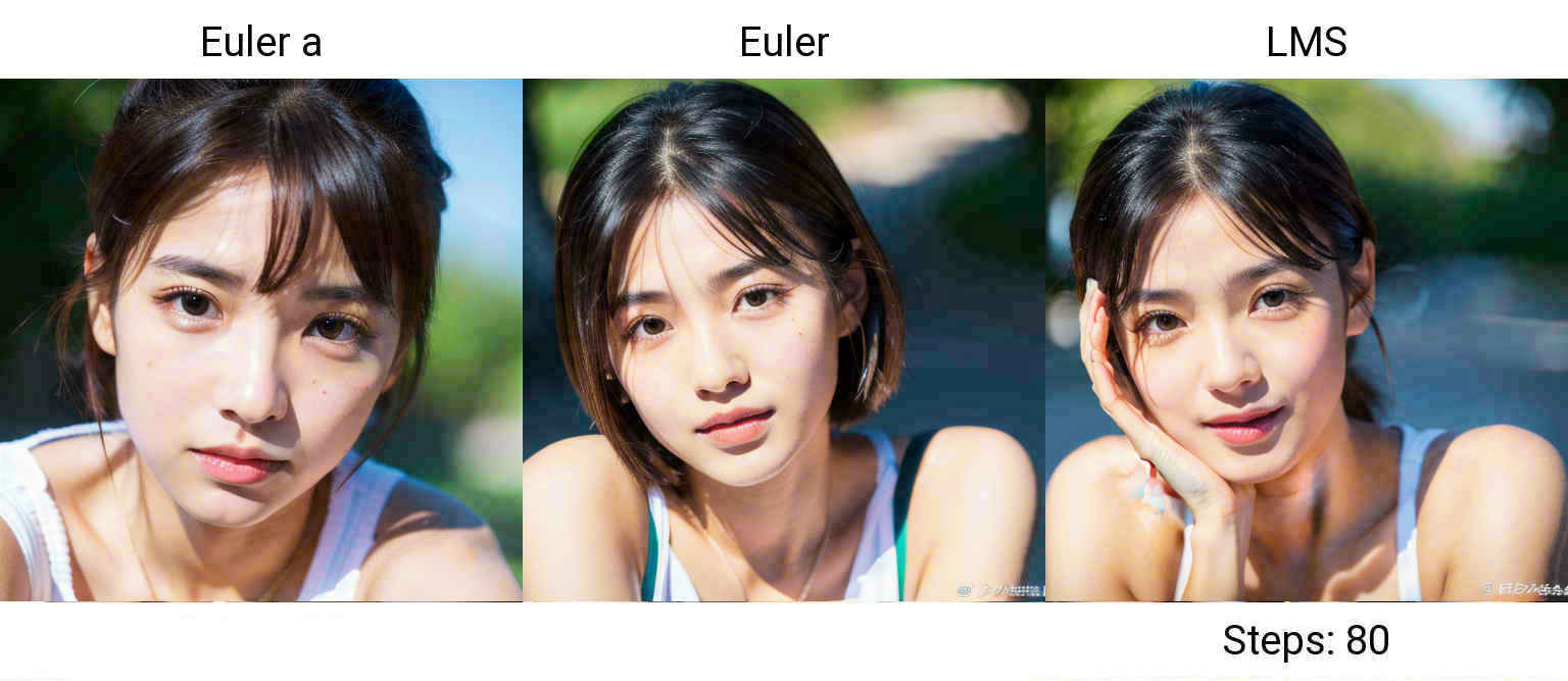 | ・DPM++ 2M SDE, DPM++ 2M SDE Heun, DPM++ 3M SDE, LMS, DPM fast, PLM,LCM デフォールト値では正常な生成ができないので 他のパラメータを調整する必要がある モデルによって差はあるがおおむね Steps 80~100 が適当 LMS の場合は回数を増やしたほうが結果は良い 80 ~ 200 |