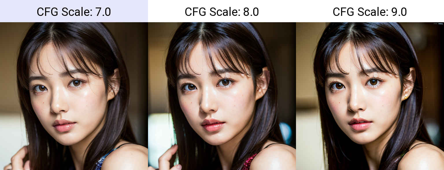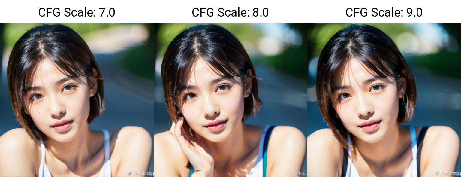 | ■ プロンプトに対してどれだけ忠実な画像を生成するかを指定する数値 ■ 数値が大きいほど、プロンプトに忠実な画像を生成。一般的に 7〜11 の範囲で数値を指定 |