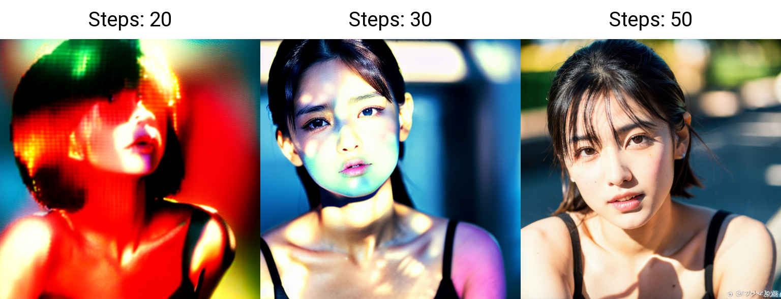 | ■ 拡散モデルによる画像生成でノイズを除去する回数 ■ サンプリング回数が多いほど繊細な画像が出力されるが画像の生成に時間がかかる |