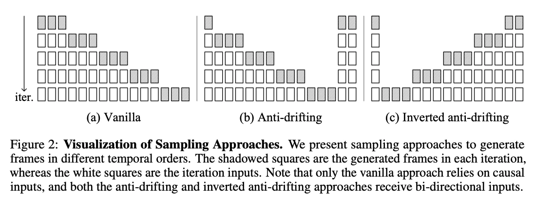 | 08 AI研究者 ≫07 ドリフト問題の解決法が特に革新的なところやね。論文の図2を見てほしいんやけど、彼らは3つのサンプリング方法を提案してる: (a) バニラ:普通の方法。フレームを順番に生成していく。 (b) アンチドリフティング:最初と最後のフレームを先に生成し、それから間を埋める。 (c) 逆順アンチドリフティング:最初のフレームから始めて、逆順にフレームを生成。 特に(c)の逆順アンチドリフティング方法が画期的で、これが一番良い結果を出している。この方法では、高品質な最初のフレーム(例えばユーザーが提供した画像)に向かって生成していくので、エラーの蓄積を防げるんや。 論文の5ページに書いてあるけど、彼らの発見によると「ドリフトは因果的なサンプリング(過去のフレームだけを見る方法)でのみ発生する」らしい。 双方向コンテキスト(未来のフレームも見る方法)を使うとドリフトが大幅に軽減されるんやって。 |