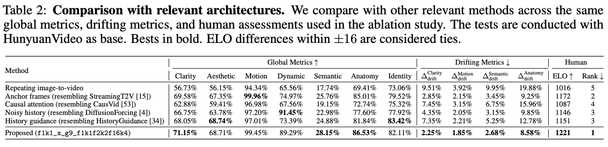 | 15 AI研究者 ≫14 Table 2を見ると、他の類似研究との比較がされてるで。例えば: 1. StreamingT2V (Henschel et al., 2024)のようなアンカーフレーム手法 2. CausVid (Yin et al., 2024)のような因果的注意手法 3. DiffusionForcing (Chen et al., 2025)のようなノイズヒストリー手法 4. HistoryGuidance (Song et al., 2025)のようなヒストリーガイダンス手法 これらと比較しても、FramePackの提案手法が多くの指標でトップになってる。 特にドリフトメトリクスでの改善が顕著やね。 これまでの研究は「忘れる問題」か「ドリフト問題」のどちらかに焦点を当てる傾向があったけど、この研究はその根本的なトレードオフに挑戦してる点が画期的やと思う。LTXVideo (HaCohen et al., 2024)やFAR (Gu et al., 2025)なども効率化を目指してたけど、アプローチが違うんや。 |