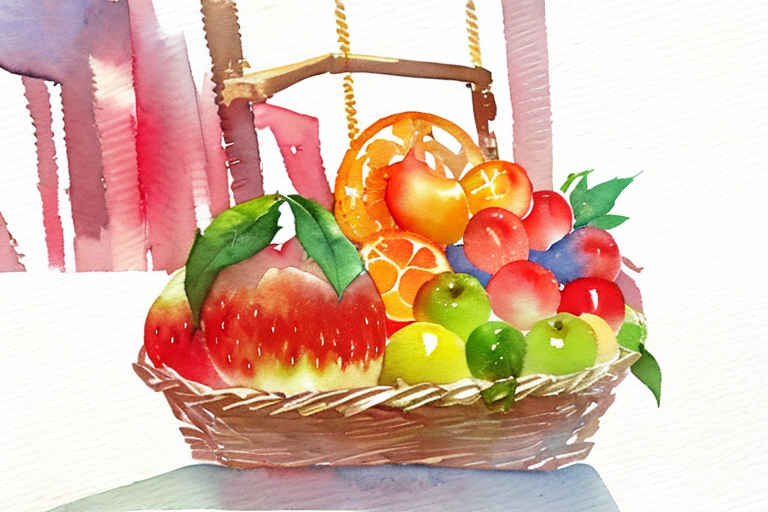 Fruits in a basket, watercolor painting, on a white background