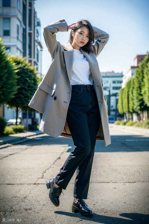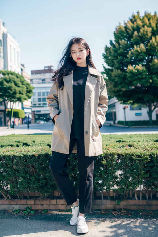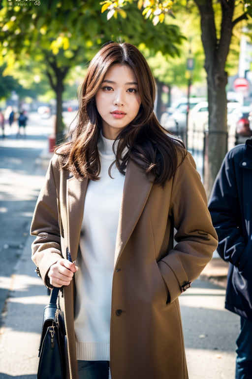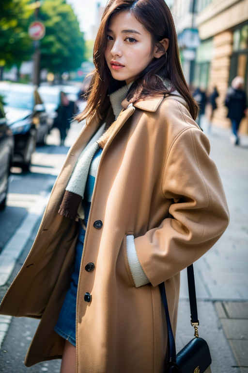 ② | (masterpiece,best quality:1.4),(8k,raw photo,photo realistic:1.2),1girl, bag, blurry background, brown eyes, brown hair, coat, day, depth of field, full body, handbag, looking at viewer, medium hair, open coat, outdoors, solo, standing | |