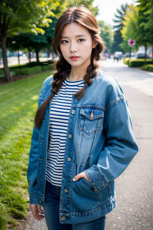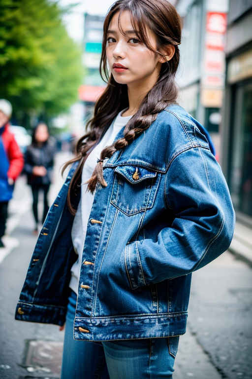 ③ | (masterpiece,best quality:1.4),(8k,raw photo,photo realistic:1.2),1girl, 3d, bag, blurry background, blurry foreground, braid, brown eyes, brown hair, building, day, denim, depth of field, hands in pockets, jacket, motion blur, outdoors, photo background, photorealistic, solo, striped | |