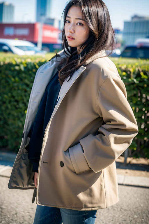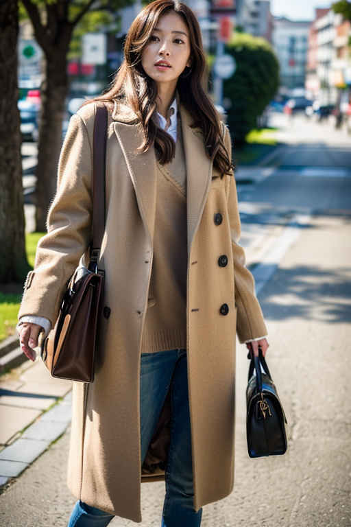 (傑作、最高品質:1.4)、(8k、生写真、写実的:1.2)、1 人の女の子、バッグ、ぼやけた背景、茶色の目、茶色の髪、コート、日中、被写界深度、全身、ハンドバッグ、見る人を見る、ミディアムヘア、開いたコート、屋外、一人、立っている | ||