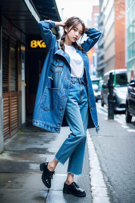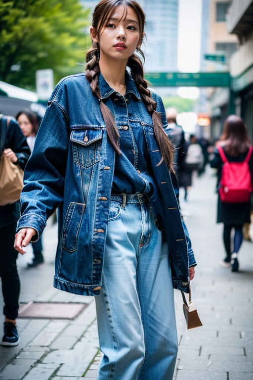 (傑作、最高品質:1.4)、(8k、生写真、写真のようにリアル:1.2)、1 人の女の子、3D、バッグ、ぼやけた背景、ぼやけた前景、三つ編み、茶色の目、茶色の髪、建物、日中、デニム、被写界深度、ポケットに手、ジャケット、モーション ブラー、屋外、写真の背景、写真のようにリアル、ソロ、ストライプ | ||