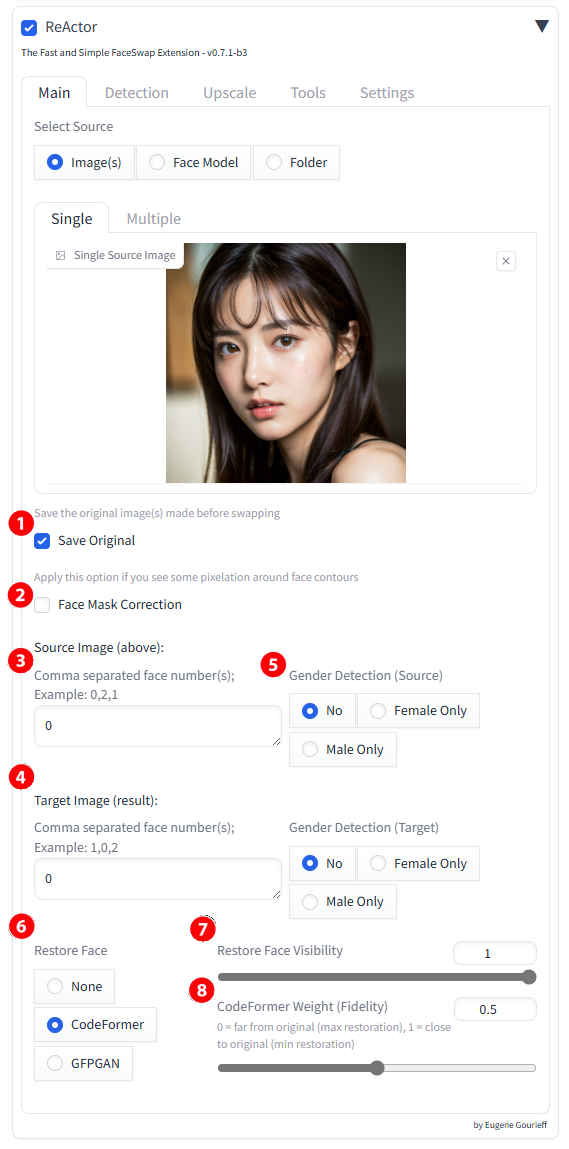 ③ | Source Image | ソース元画像が複数人居る場合にどの人物の顔を適用するか |