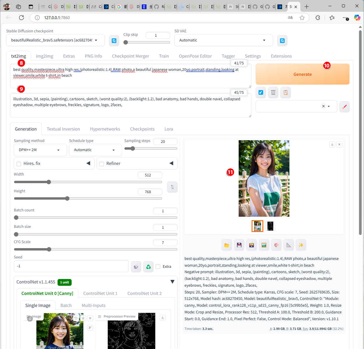 Parameter | Steps: 20, Sampler: DPM++ 2M, CFG scale: 7, 512x768, Clip skip: 1, Model: beautifulRealistic_brav5 |