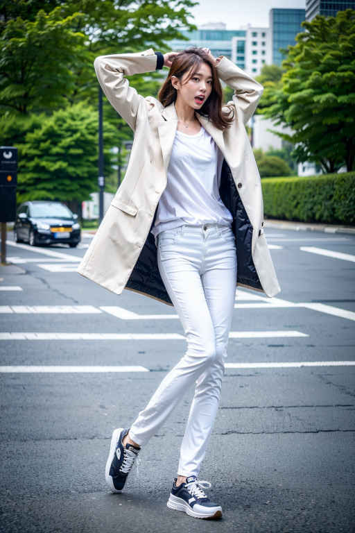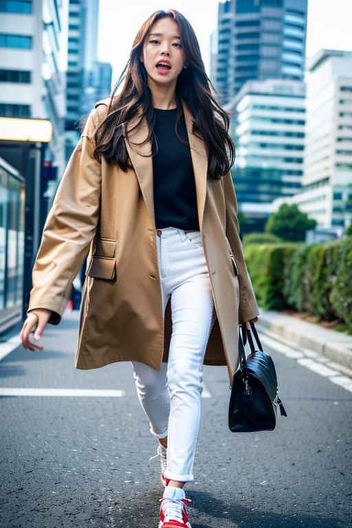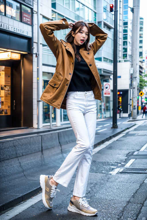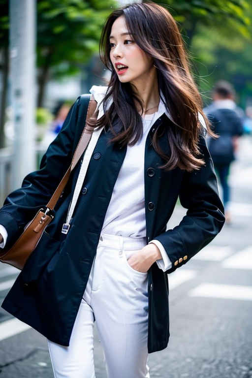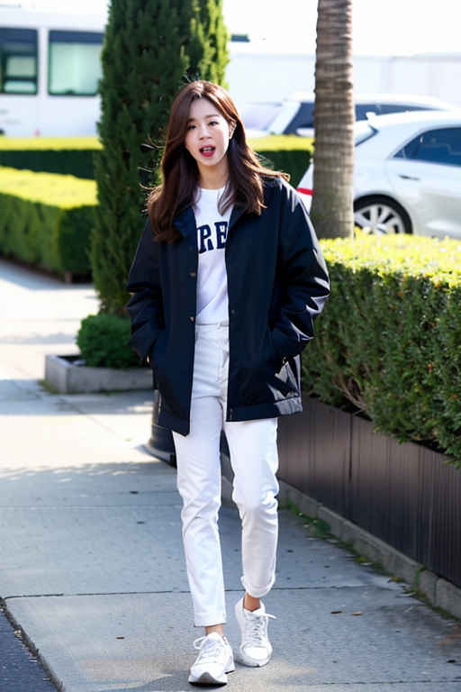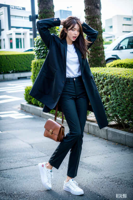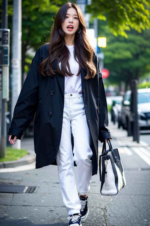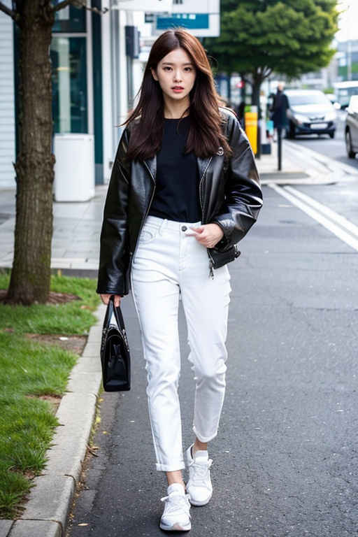 Prompt | solo, pants, shoes, bag, white pants, shirt, jacket, white shirt, realistic, hand in pocket, sneakers, brown hair, white footwear, 1girl, outdoors, looking at viewer, full body, long hair, open mouth, blurry, photo background, standing, handbag, walking, open clothes, black jacket |