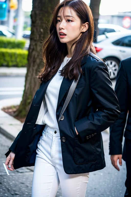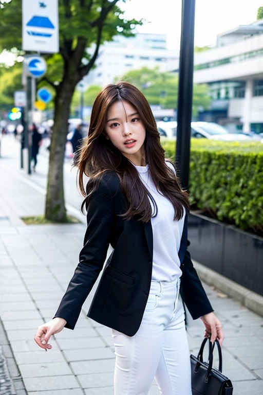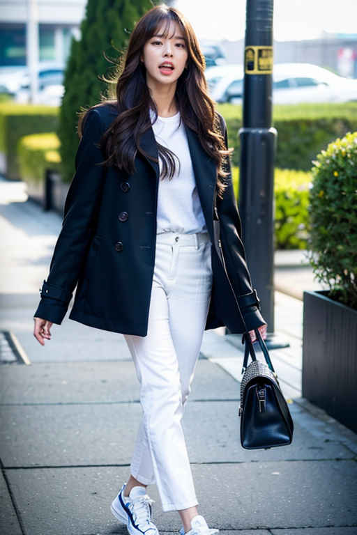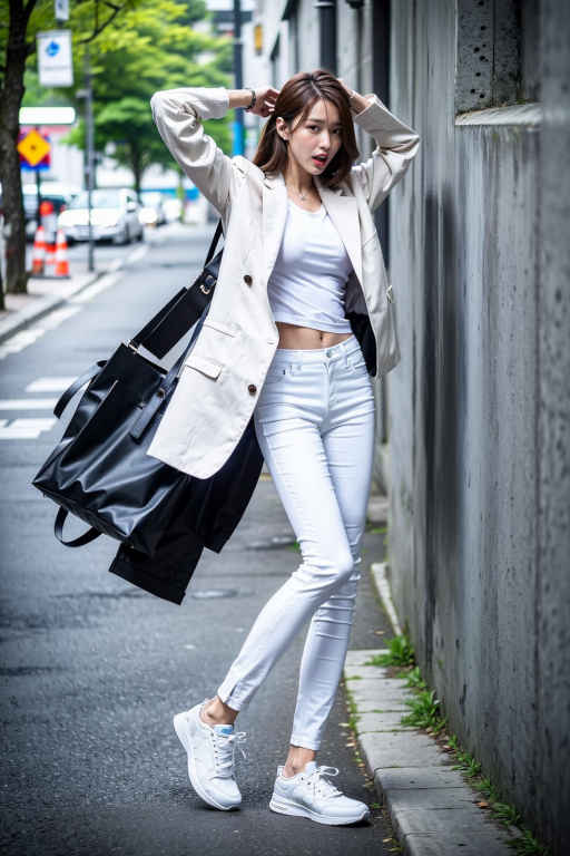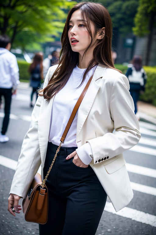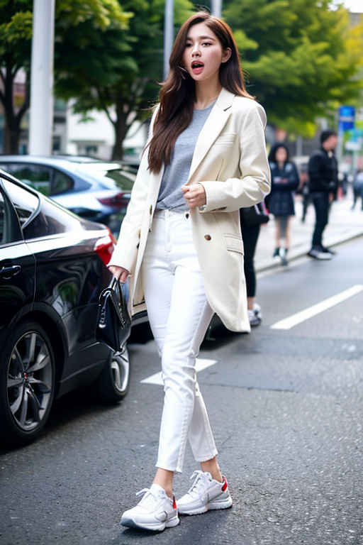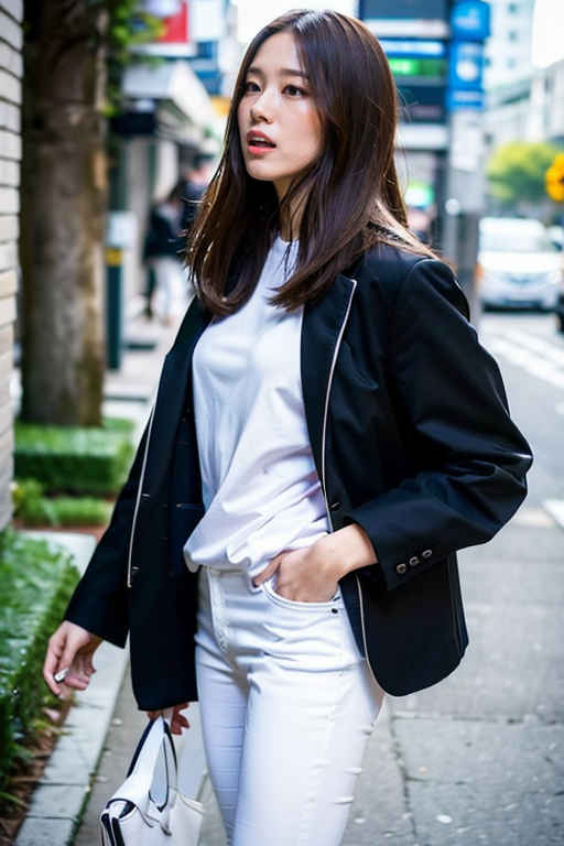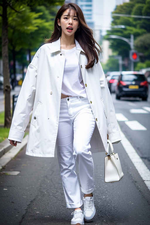 ソロ、パンツ、靴、バッグ、白いパンツ、シャツ、ジャケット、白いシャツ、リアル、ポケットに手、スニーカー、茶髪、白い履物、女の子 1 人、屋外、見る人を見る、全身、長い髪、口を開けている、ぼやけている、写真の背景、立っている、ハンドバッグ、歩いている、はだけた服、黒いジャケット | |